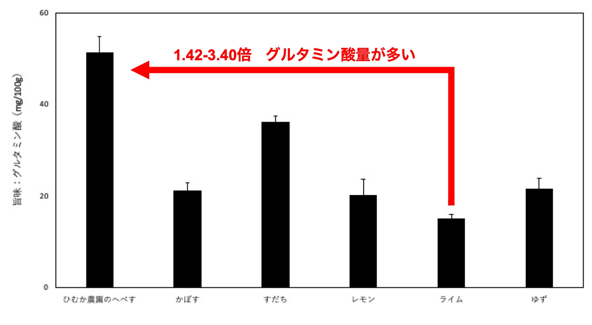 「ひむか農園のへべす」のグルタミン酸量はかぼす、すだち、レモン、ライムおよびゆずよりも2.42倍、1.42倍、2.54倍、3.40倍および2.37倍多い