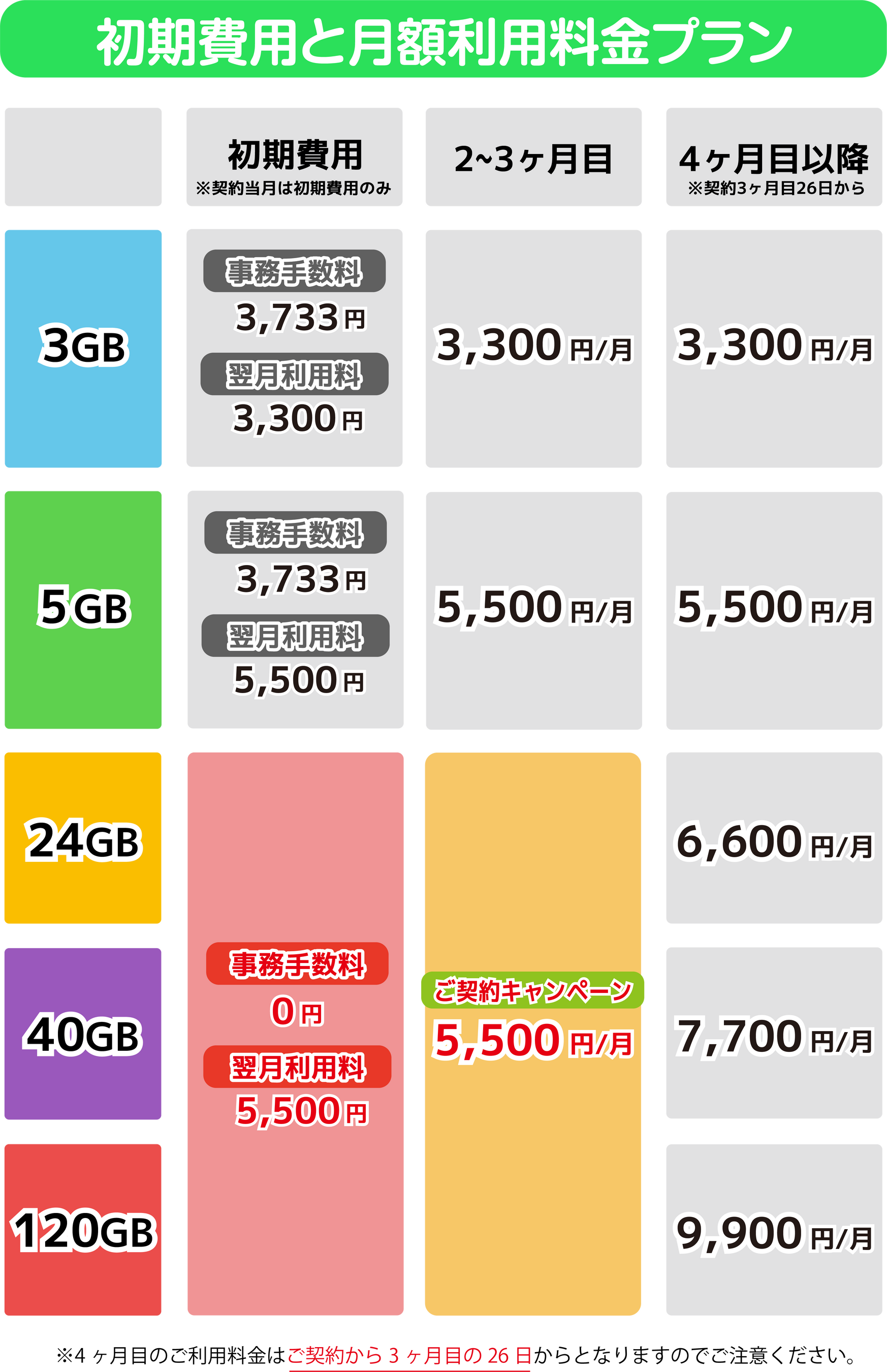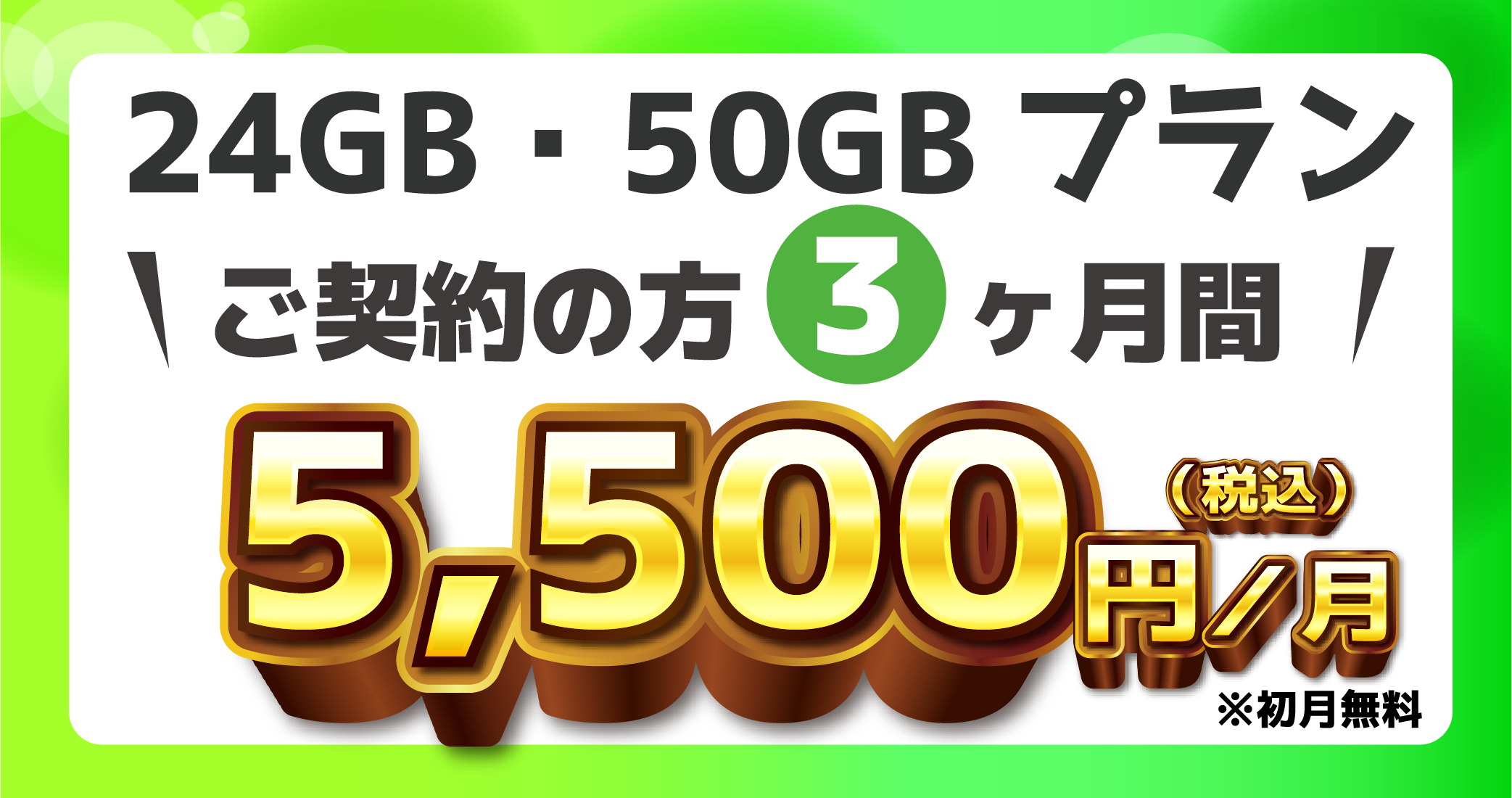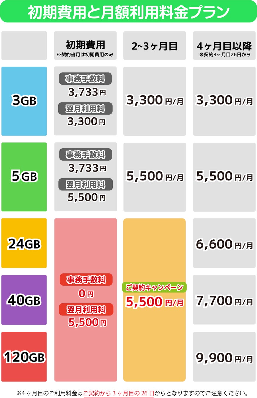 ご契約時に24GB・40GB・120GBプランをお選び頂くと3ヶ月間プラン料金が5,500 円(税込)でご利用頂けます。初月はすべてのプランにおいて無料です。