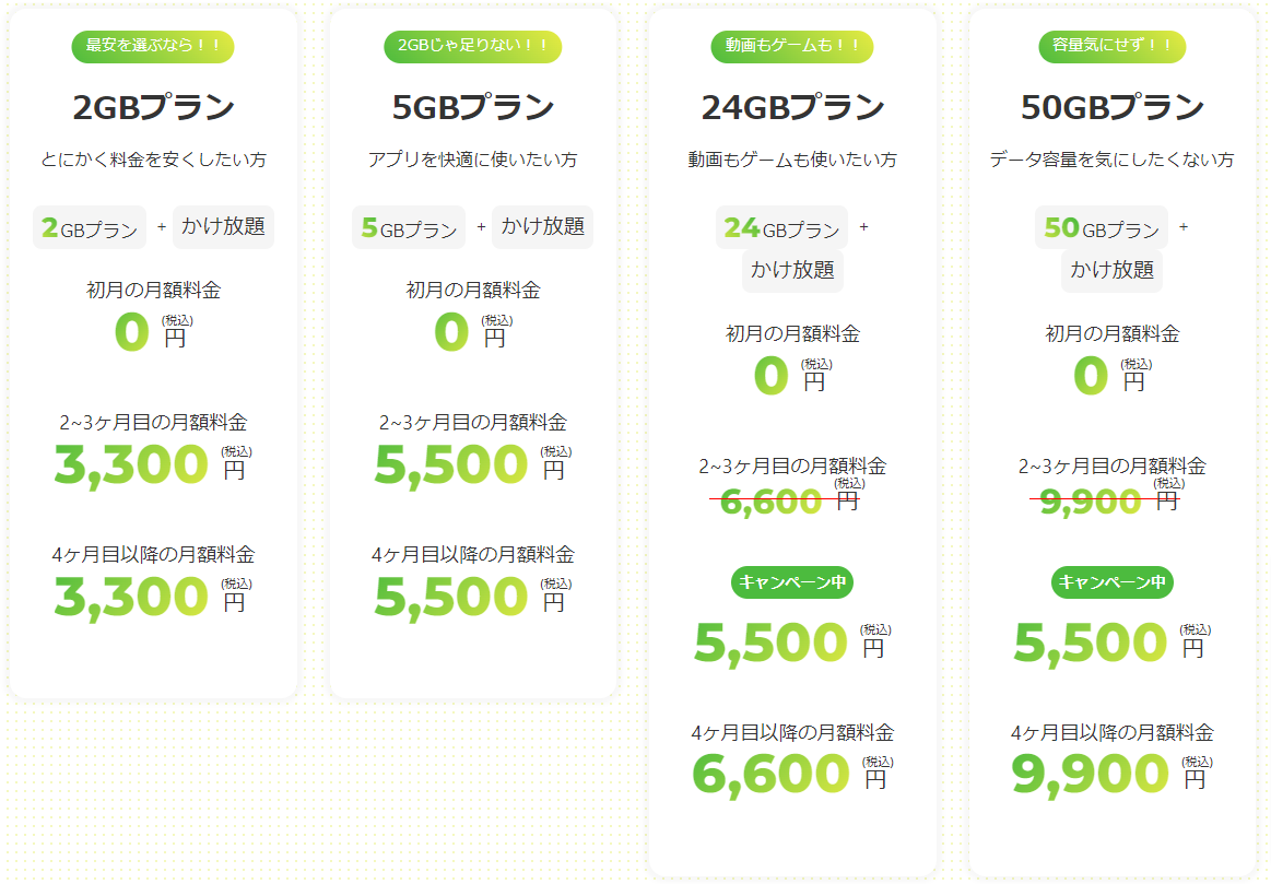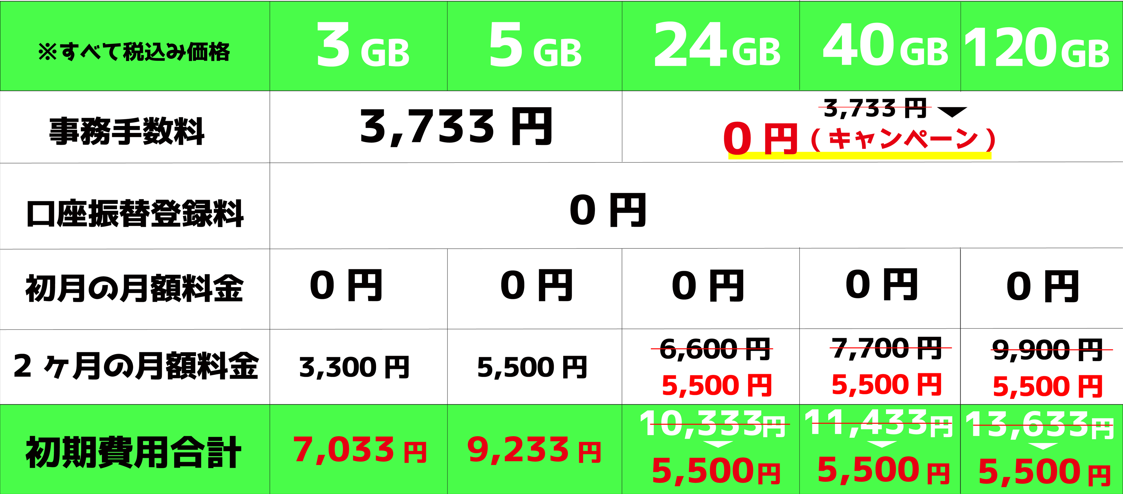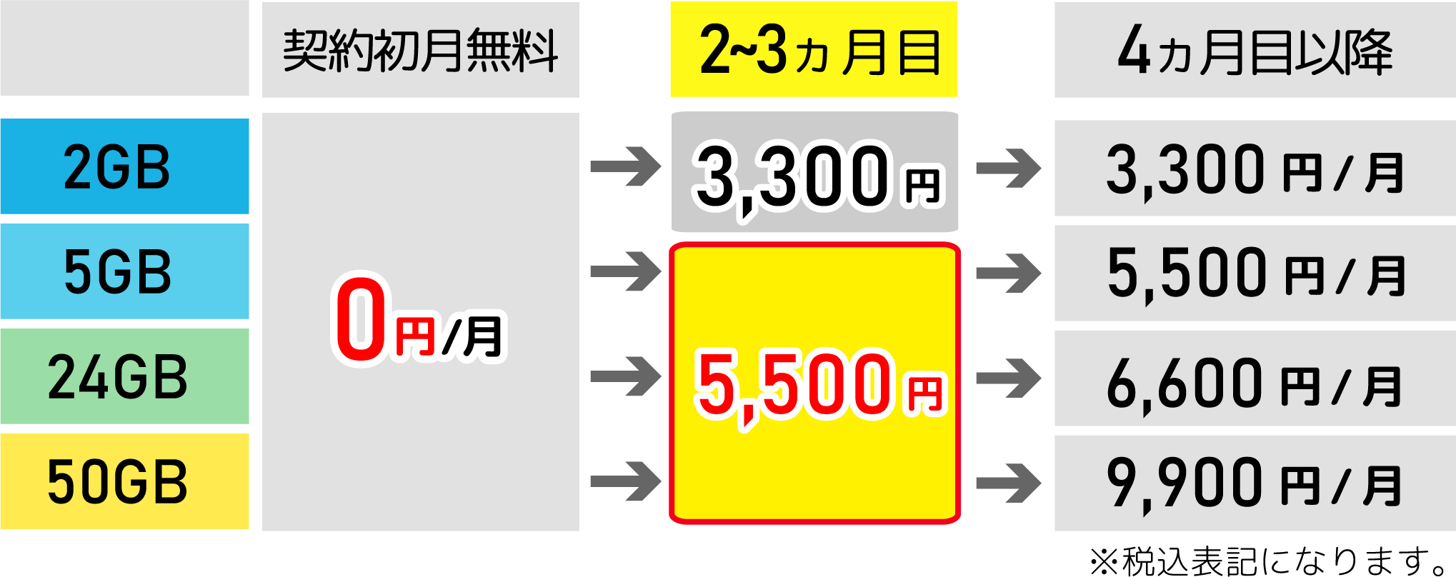 ご契約時に24GB・40GB・120GBプランをお選び頂くと3ヶ月間プラン料金が5,500 円(税込)でご利用頂けます。初月はすべてのプランにおいて無料です。