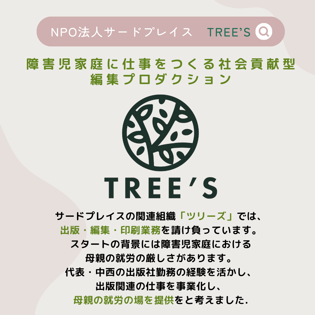 脳性まひ児とその家族を支援するNPO法人サードプレイス主催、障害児家庭の就労の環境の改善を目指す、障害児家庭に仕事をつくる社会貢献型編集プロダクション「TREE’S」