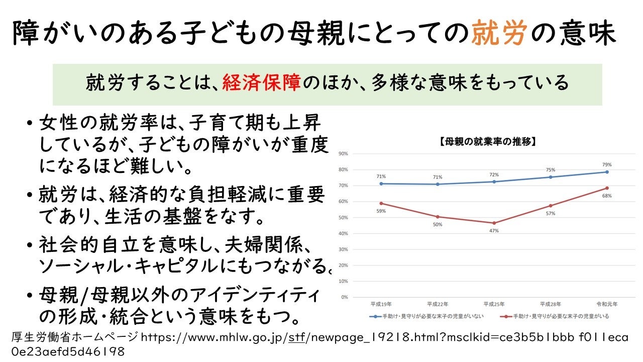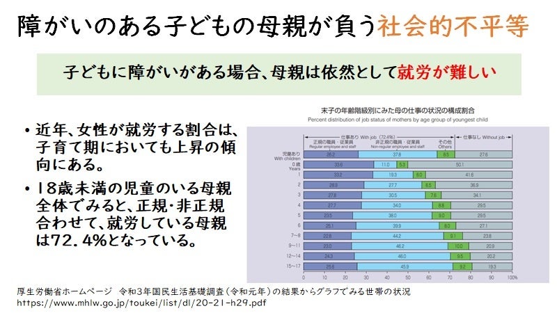 ケアをするのは「母親」になっている家庭が大半で、中には障害の影響でシングルになる方も多くいらっしゃいます。共働きが一般的になり、健常児では年齢が上がると母親が就労することが多いですが、障害児は「介護」の側面もあり、手が離れず就労困難となります。