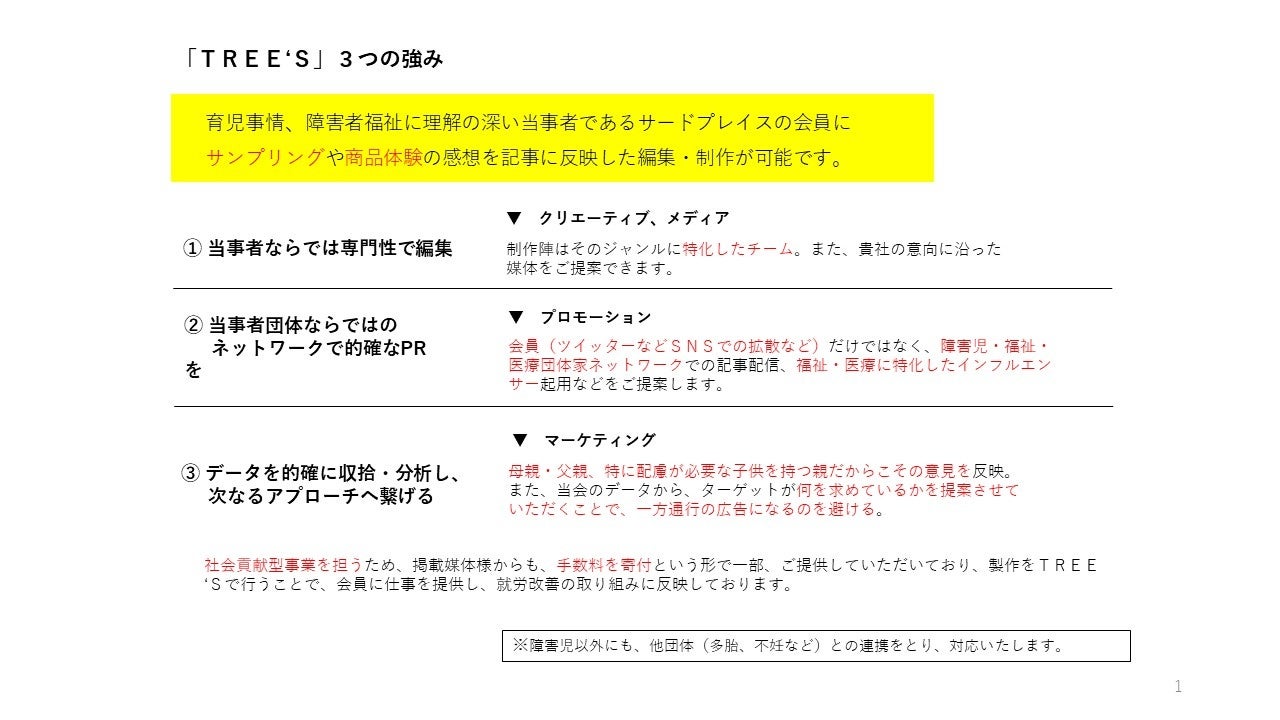 育児事情、障害者福祉に理解の深い当事者であるサードプレイスの会員にサンプリングや商品体験の感想を記事に反映した編集・制作が可能です。