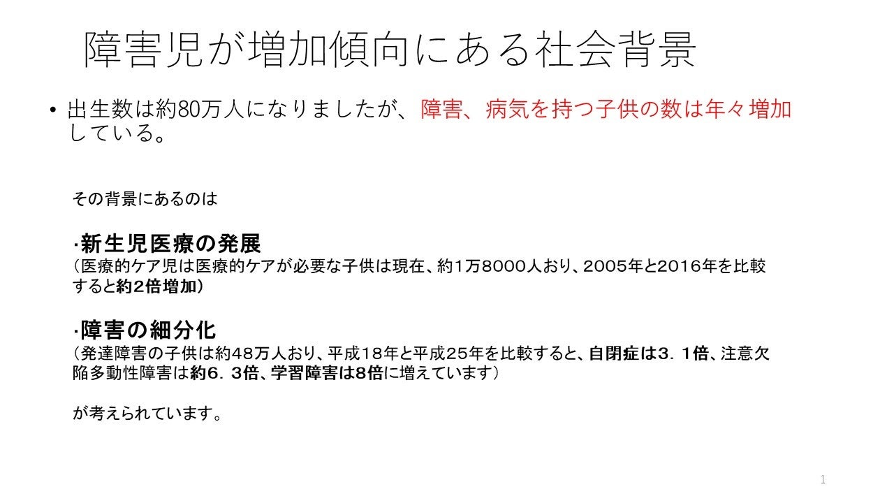 障害児家庭は年々増加傾向になります。その主な要員は医療の発展、そして、障害の細分化です。