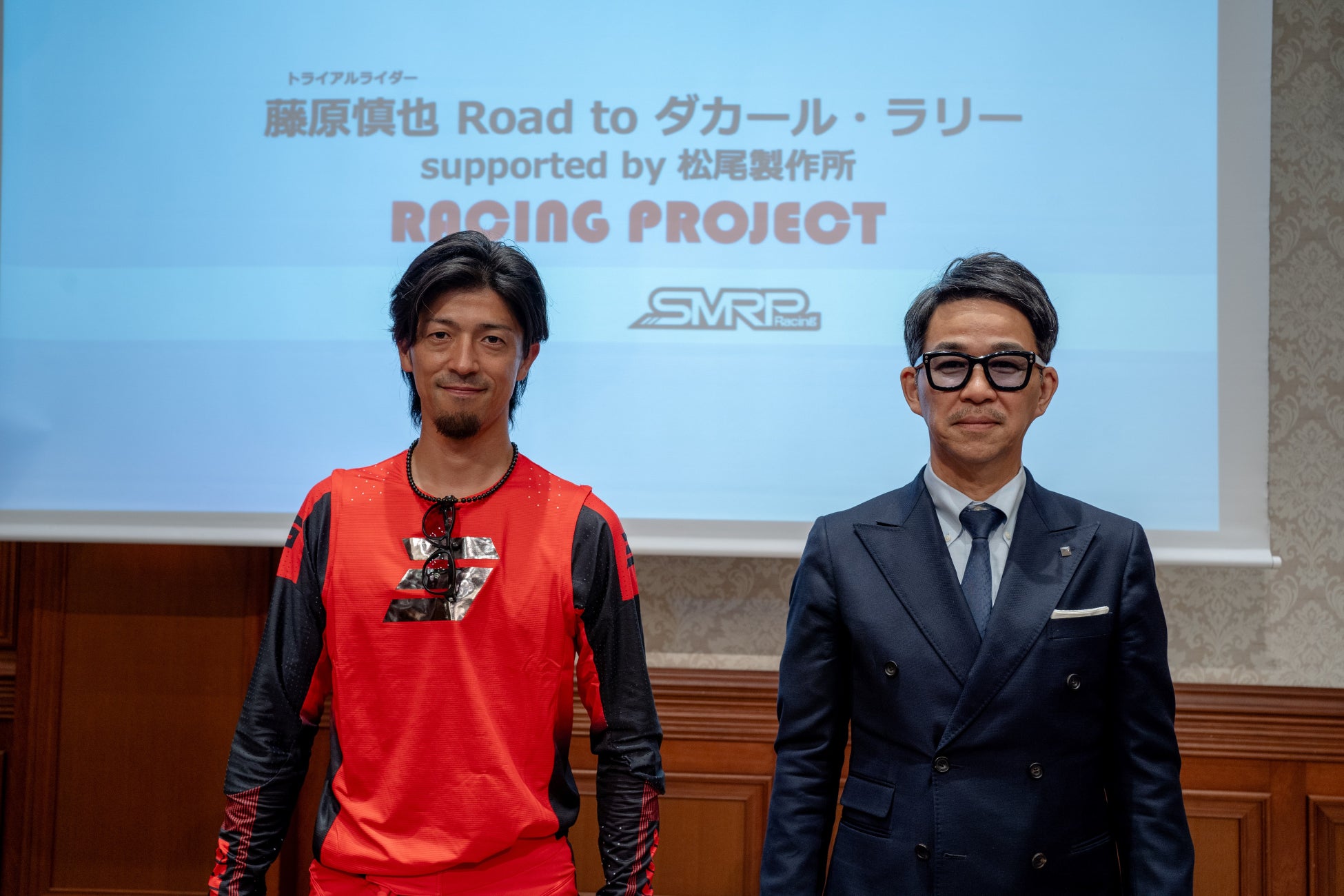メインスポンサーを務める株式会社松尾製作所 取締役社長である松尾基が、記者会見に登壇。「藤原選手との出会いは、2023年8月頃でした。彼に自身の夢を語って頂いた時の目は今でも忘れられません。彼の決意は並大抵のものではないと感じ、ダカール・ラリーの完走を後押しさせて頂きたいと感じました。」と藤原選手との出会い、当時のエピソードについてコメント。