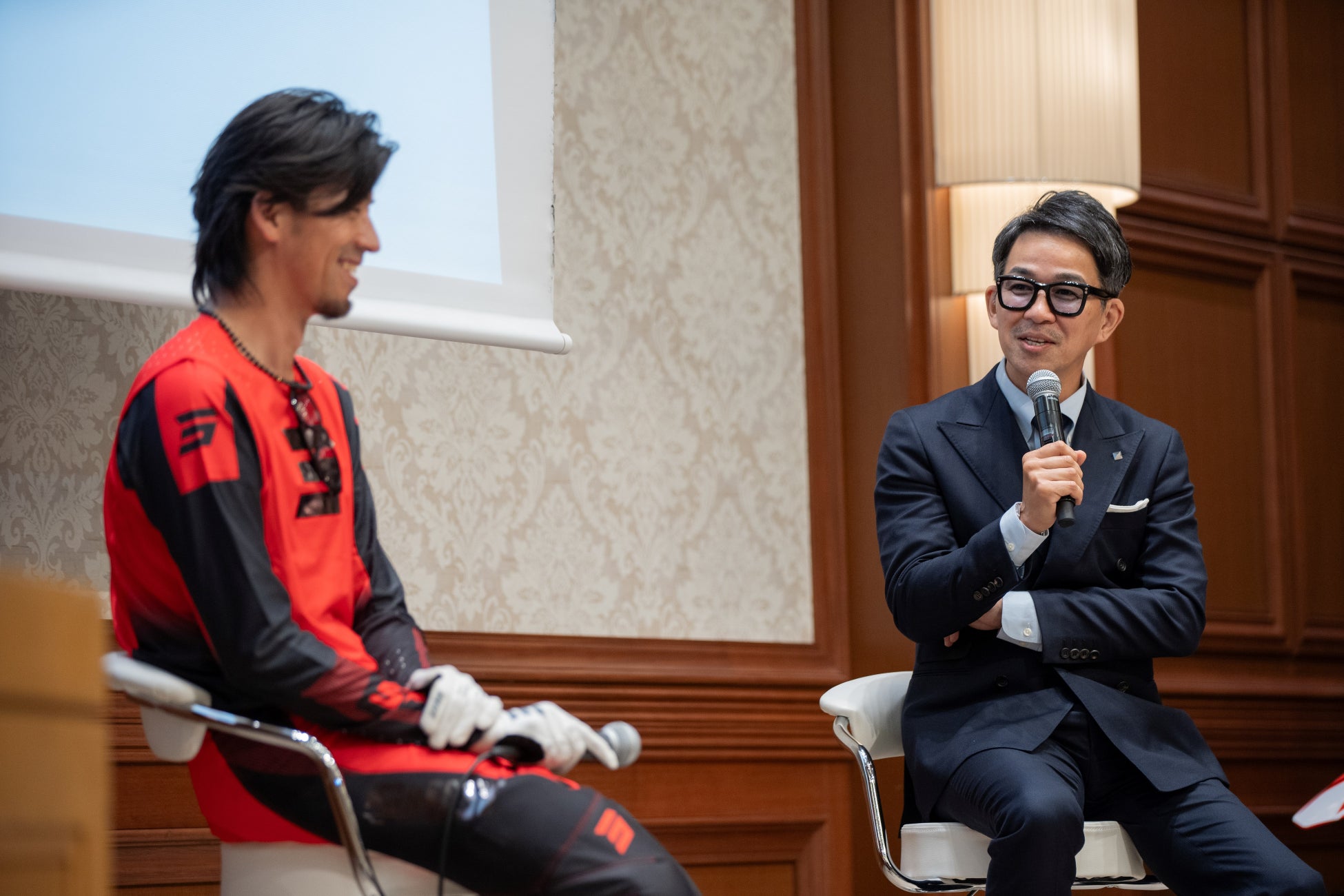 藤原選手は挨拶の後、壇上で松尾とトークを展開。その中で、MCからプロジェクトの目標達成に向けた体制を聞かれると、「全てのオフロードライダーの憧れの先にあるのがダカール・ラリーです。このレースに挑戦することができる人は限られている中で、私の挑戦が松尾製作所によるサポートのお陰で実現でき、とても嬉しいです。協賛企業という枠組みを超えて、私の人生を応援してくださる姿勢にとても感謝しています。社員の皆様と共に”思いの火”を感じ起こし、完走を果たしたいです。」とコメント。