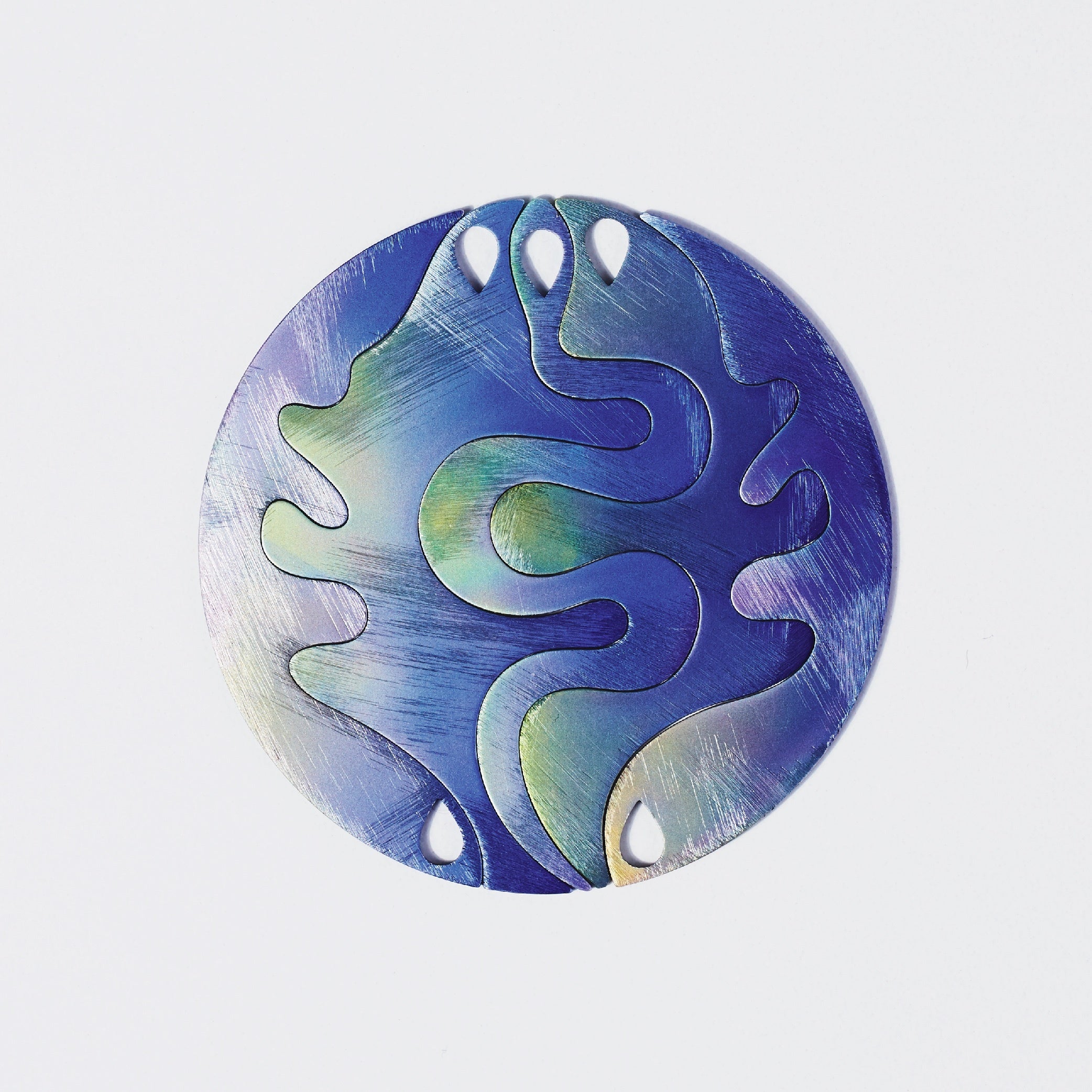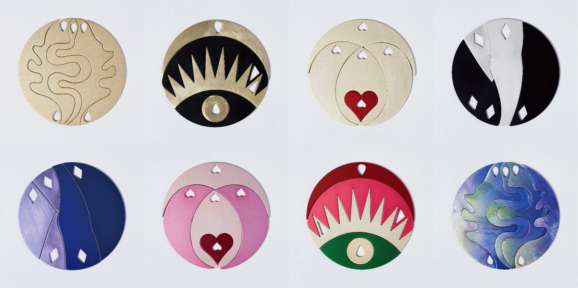 複数のパーツから構成された8つの円。パーツを自由に組み合わせ、付属のリングピアスに通して身に着けます。その日の気分で何通りもの異なるアレンジが楽しめます。化粧パレットから色を選ぶ感覚で楽しんでください。