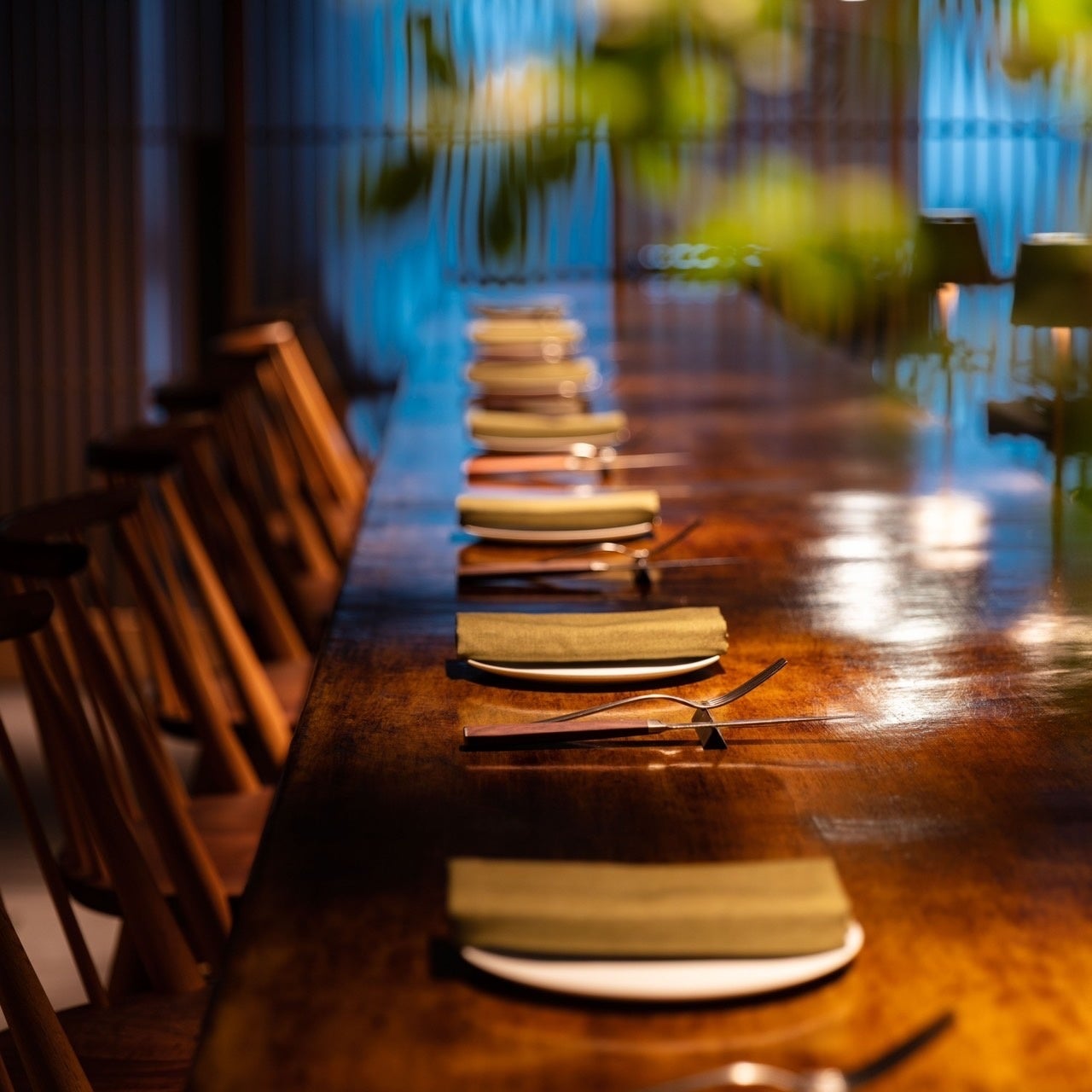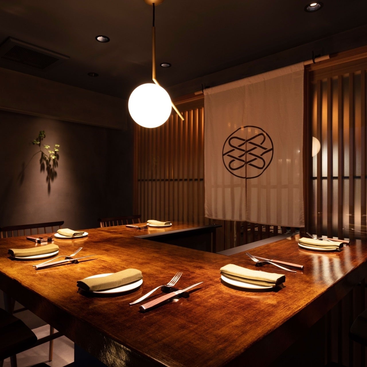 「tsumugi」では、国産漆をふんだんに使用した漆塗カウンターを設置し、有形文化財の修復も手掛ける漆工・安宅信太郎により、6層にも塗り重ねられた堅牢かつ優美なカウンターとなっております。また、人目を気にせずゆっくりお食事を楽しみたいお客様のために、6名様まで対応可能な個室も完備。格子戸で隔てられた空間に設置されたコの字型のカウンターは、お客様間、さらにはお客様とスタッフとのスムーズな会話が生まれる設計となっております。
