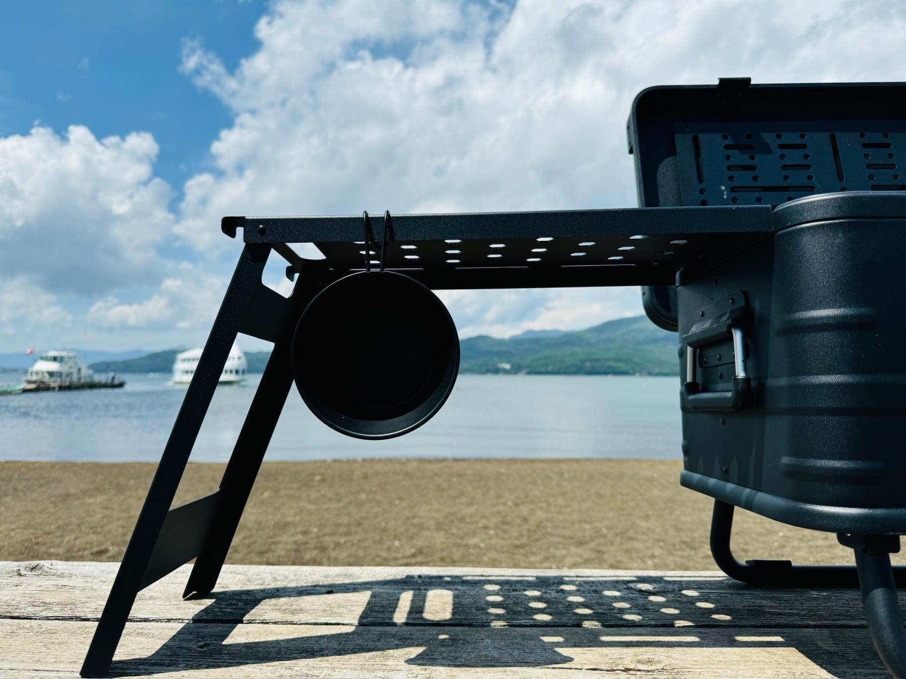 CB缶(カセットガスボンベ)を固定できる拡張パーツも同梱してお届けします! CB缶を横面にセットしてお持ちのバーナーをセットすれば作業台キッチンになります。