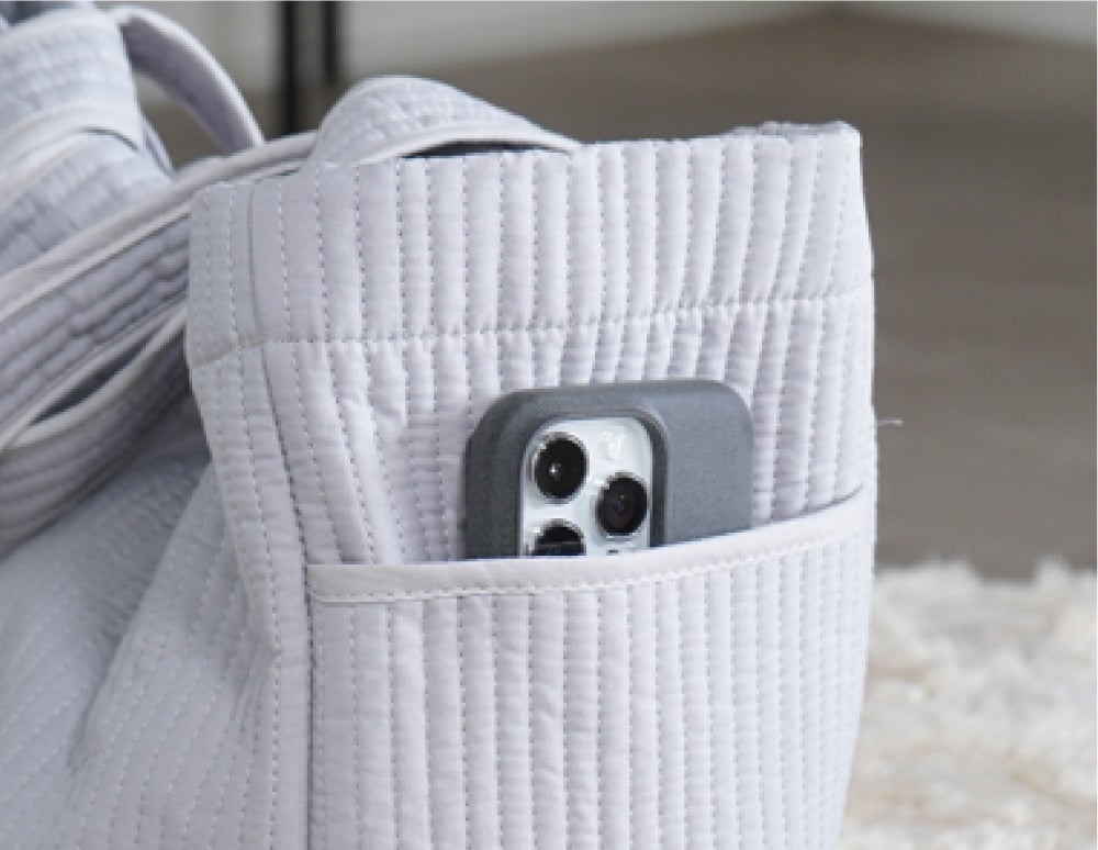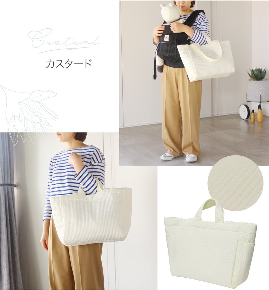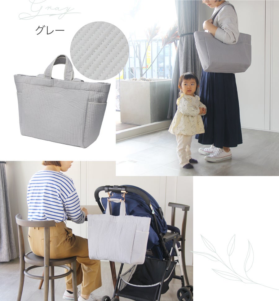 柔らかな風合いが楽しめるコットンのキルティング生地で、使い分けができるたくさんのポケットを備えた、アレコレこだわりのマザーズバッグです。
