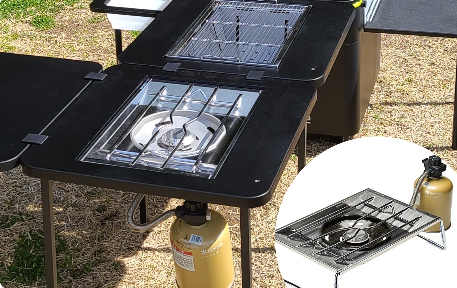 専用のグリルは、折り畳んで収納可能。普段は収納BOX内にあるから、グリルの保管場所に困りません。またテーブルには、キャンパーに人気のスノーピーク製フラットバーナー(GS-450R)がピッタリ入ります。