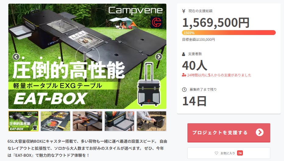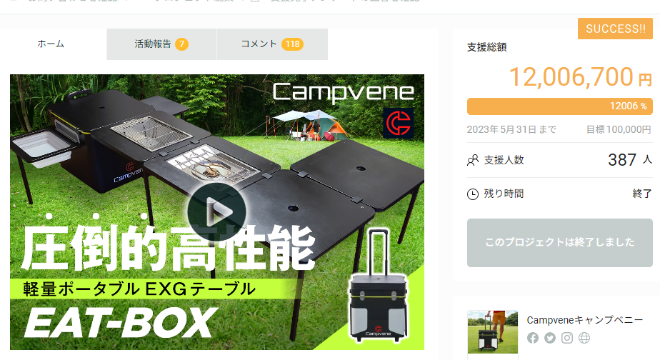 アウトドアをもっと「身軽に、便利で、楽しく」株式会社ベネシス(本社:山口県周南市、代表:加屋野剛士)が運営するアウトドアブランドCampveneキャンプベニーから、待望の軽量ポータブルキャンプテーブル『EAT-BOX』が、国内最大級クラウドファンディングサイト「CAMPFIRE」にて募集を実施中です。募集期間は2023年6月1日(木)から6月30日(金)です。