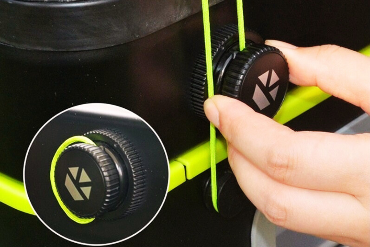 SAFETY LOCKを引っ張り、フックから高強度ロープを外しテーブルや脚、ジョイントパーツを組み合わせて準備OK。たった5分で組み立てられるから、すぐにキャンプやバーベキューを楽しめます。