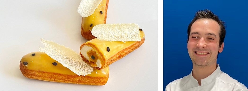 夏の暑さを感じるこの季節にぴったりな、エキゾチックフルーツを使用したエクレア。シュー生地の中には、ココナッツクリーム、マンゴークリーム、パッションフルーツソースが入っています。マンゴーとパッションフルーツのグラッサージュを施し、ココナッツホワイトチョコレートでデコレーションをしました。