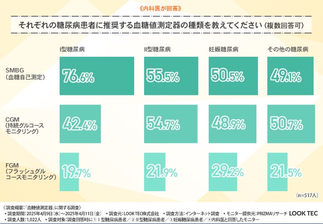 そこで今回、LOOK TEC株式会社は、①Ⅰ型糖尿病患者/②Ⅱ型糖尿病患者/③妊娠糖尿病患者/④内科医を対象に、「血糖値測定器」に関する調査を行いました。