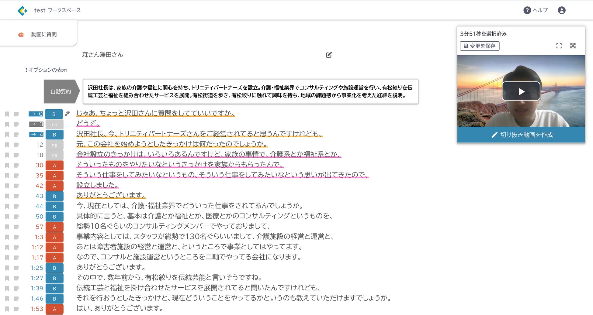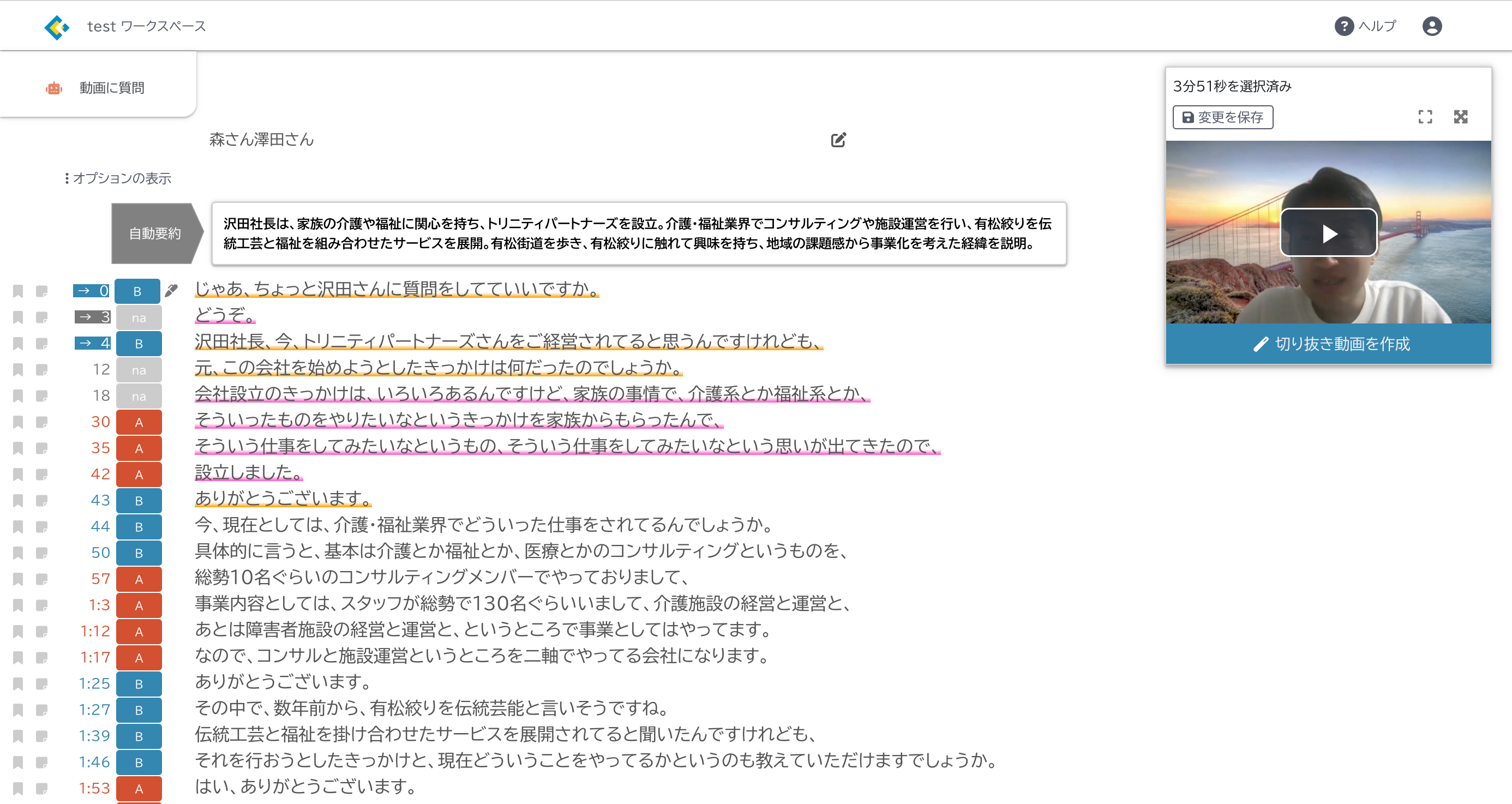 - 文字起こしされたテキストを選択することで動画を切り取ったり、ダイジェスト動画を作成できる機能