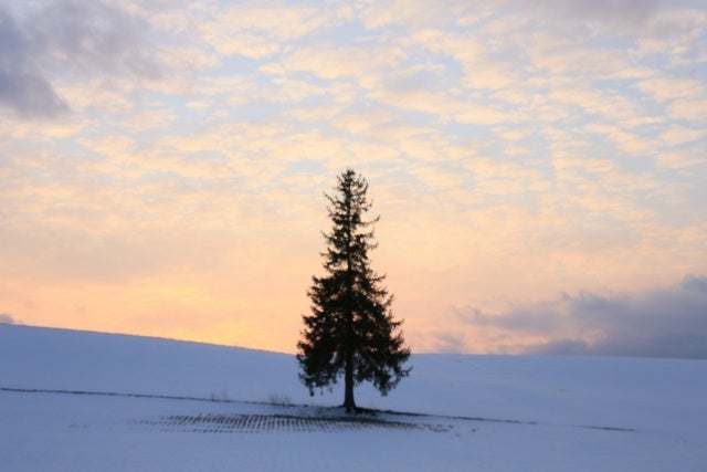 北海道旭川市の大自然の中に1本佇むクリスマスツリーの木。