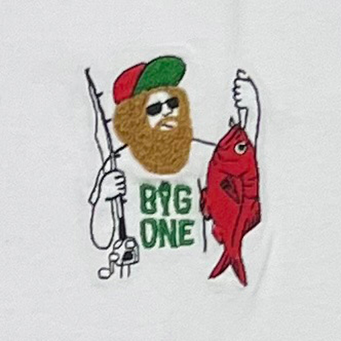 モジャッシュが伊豆の名産品であるキンメダイ釣りを楽しむ姿をプリントしたTシャツ。キンメダイ釣りは駿河湾2000メートル深いところで釣るため、パワフルなリールを搭載した特別な釣り竿にこだわりました。キンメダイの大きい目、ひれの形など忠実に表現しました。キンメダイの旬は冬と初夏の2回ありますが、初夏のキンメダイを描いています。お刺身としていただくのが最適です。