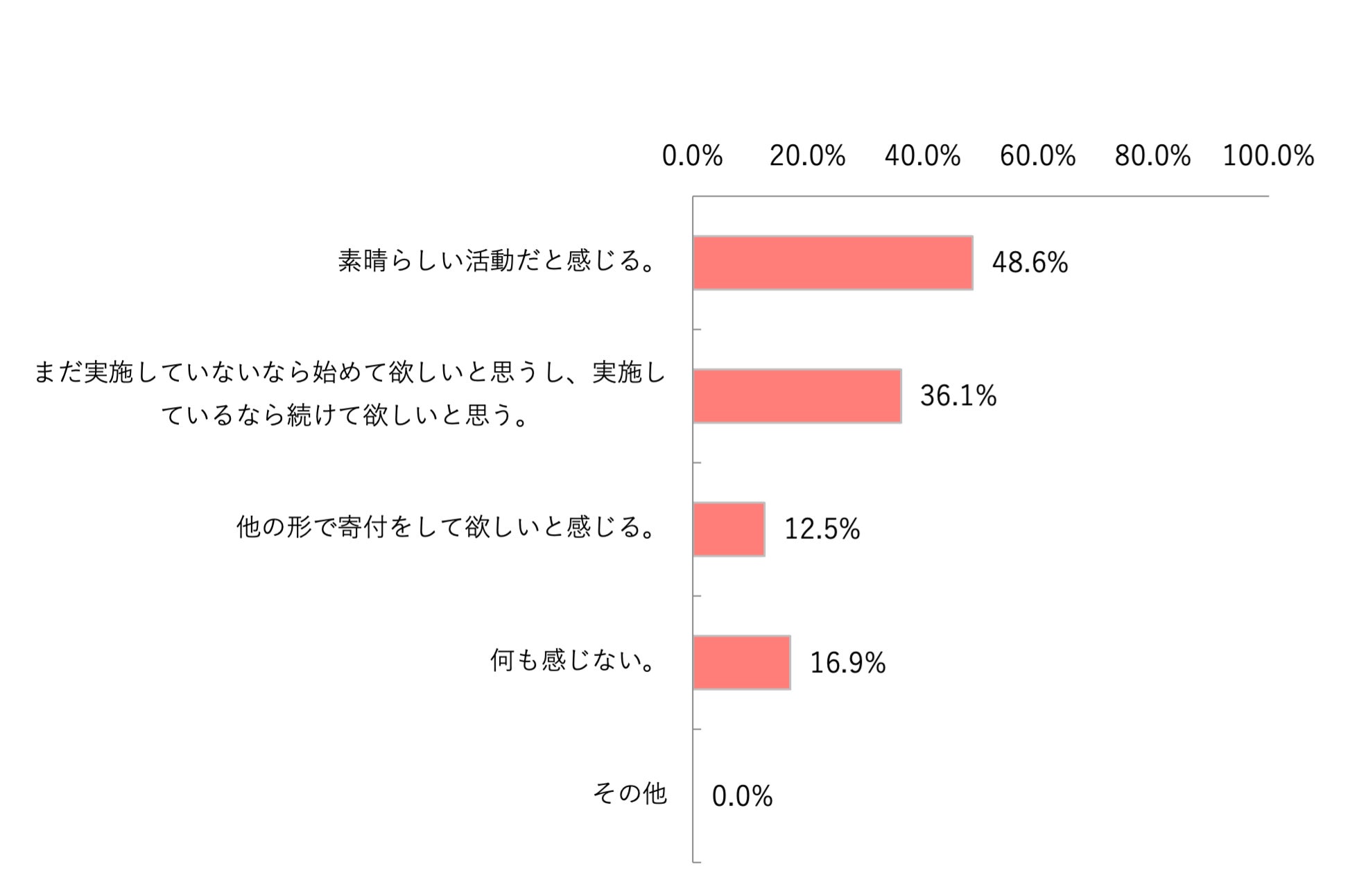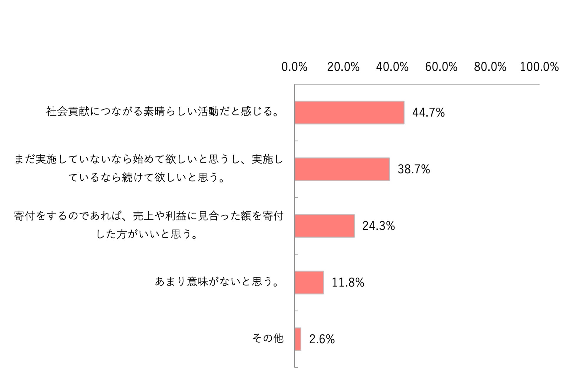 Q3の結果より、企業の寄付活動に関しては44.7%の学生が「社会貢献につながる素晴らしい活動だと感じる」、38.7%の学生が「まだ実施していないなら始めて欲しいと思うし、実施しているなら続けて欲しいと思う」と回答しているため、企業の寄付活動に対する関心度は非常に高いと言えます。