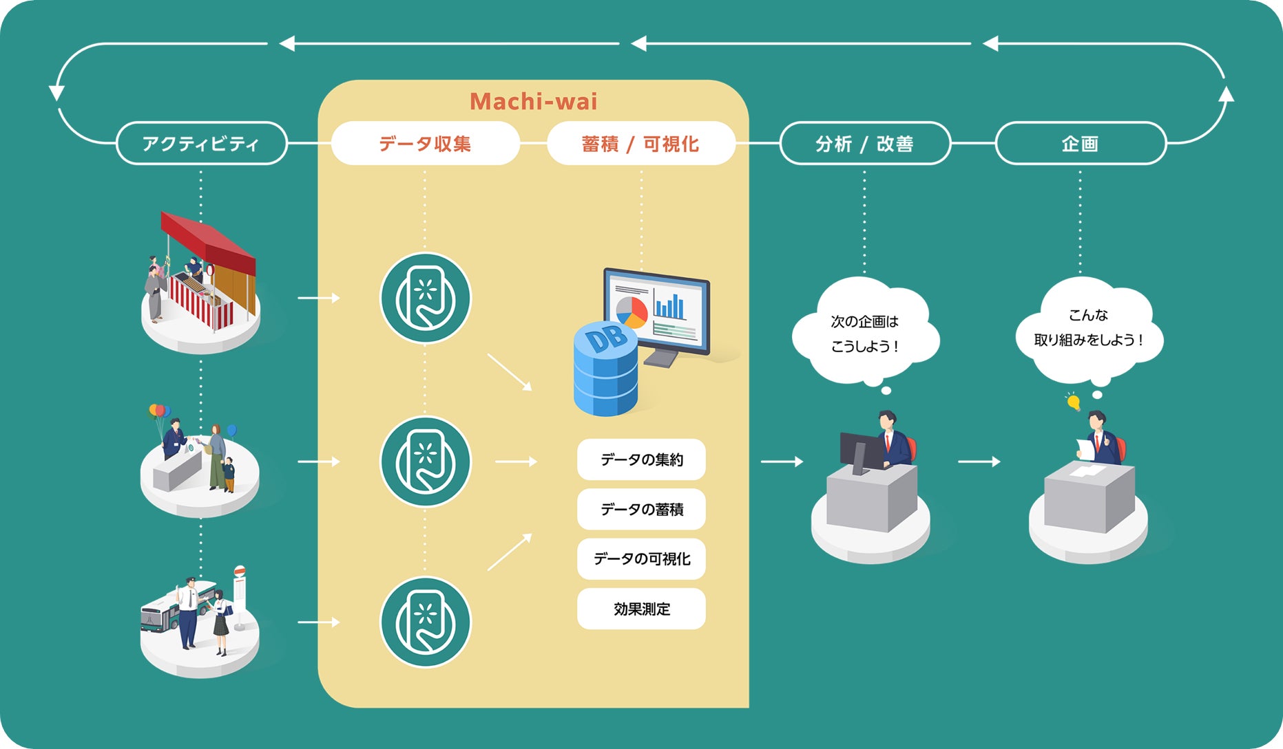 「Machi-wai」は自治体さま・DMOさま、各種まちづくりを行う企業さまが取り組むエリアマネジメントにおいて、経験や感覚ではなく、根拠に基づいたデータを収集・提供することで、企画から改善のトライ&エラーを簡略化し、街のファンづくりをサポートするサービスです。