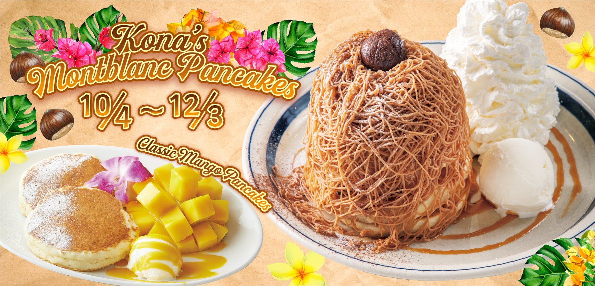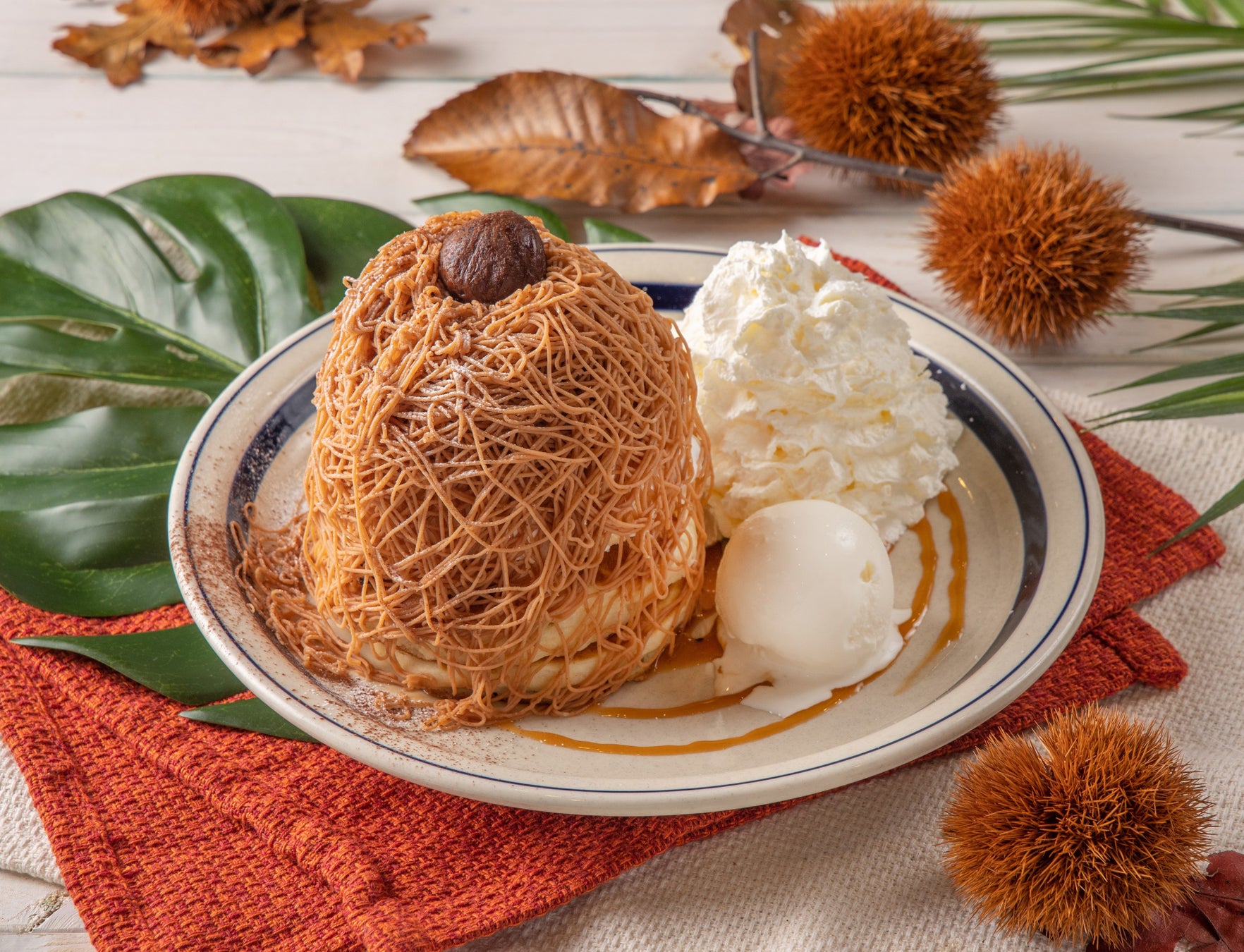 “いちばん近いハワイ”をコンセプトに掲げるコナズ珈琲から秋の味覚の栗とラム酒の香り漂うハワイ仕立ての「コナズモンブランパンケーキ」が登場!