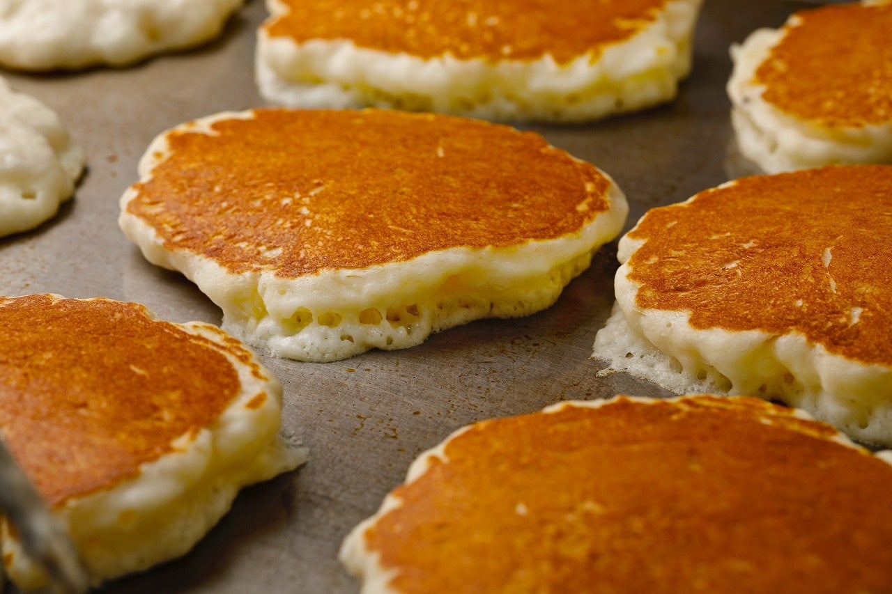 素材にこだわったパンケーキは、店内で生地から手づくりし、オーダーが入ってから一枚ずつ丁寧に焼き上げます。コナズ珈琲オリジナルレシピのパンケーキは、ふわふわしっとりやわらかな口当たりが特徴です。ほのかな塩味をきかせており、スイート系はもちろん、ミール系との相性も抜群です。