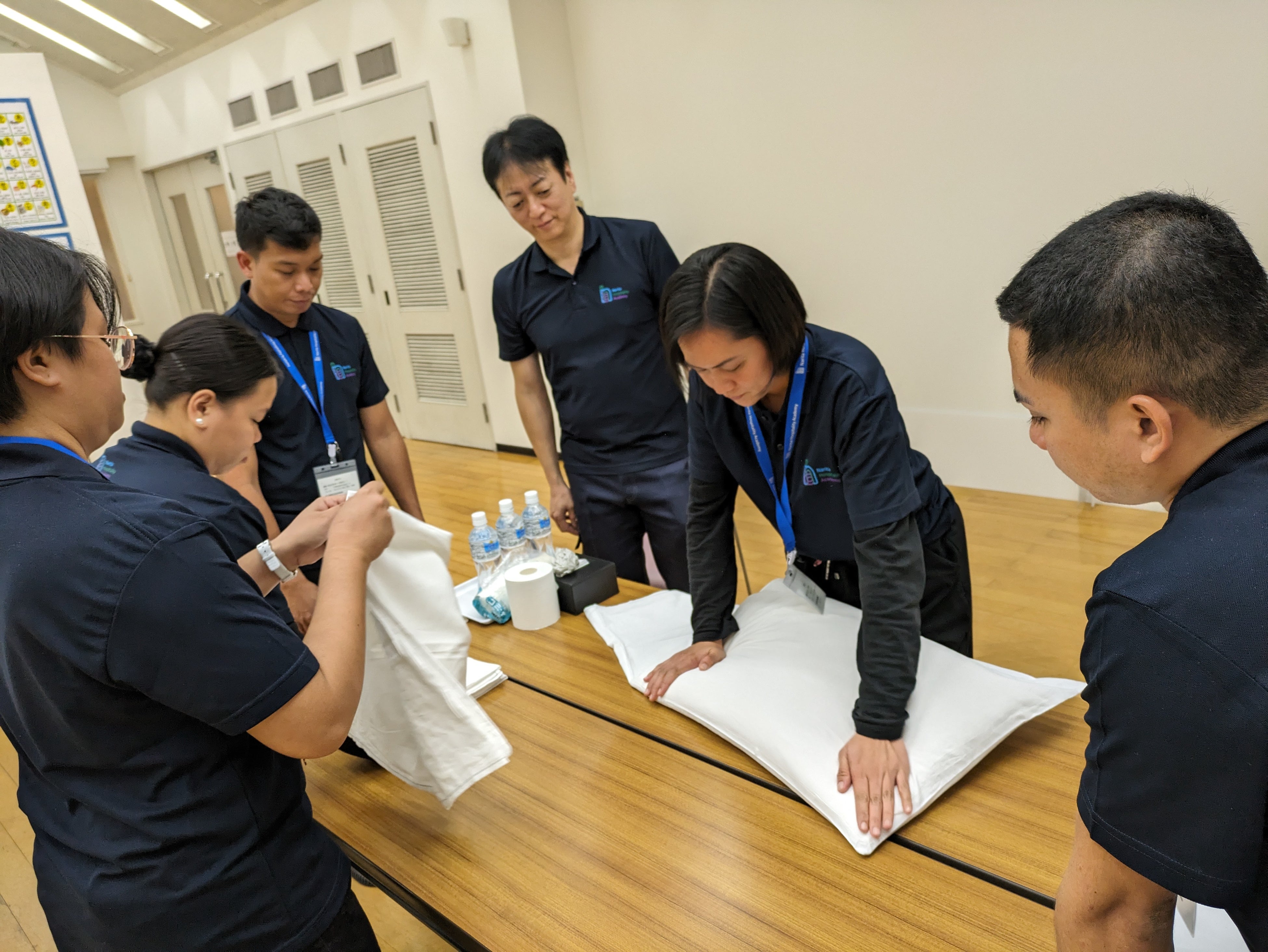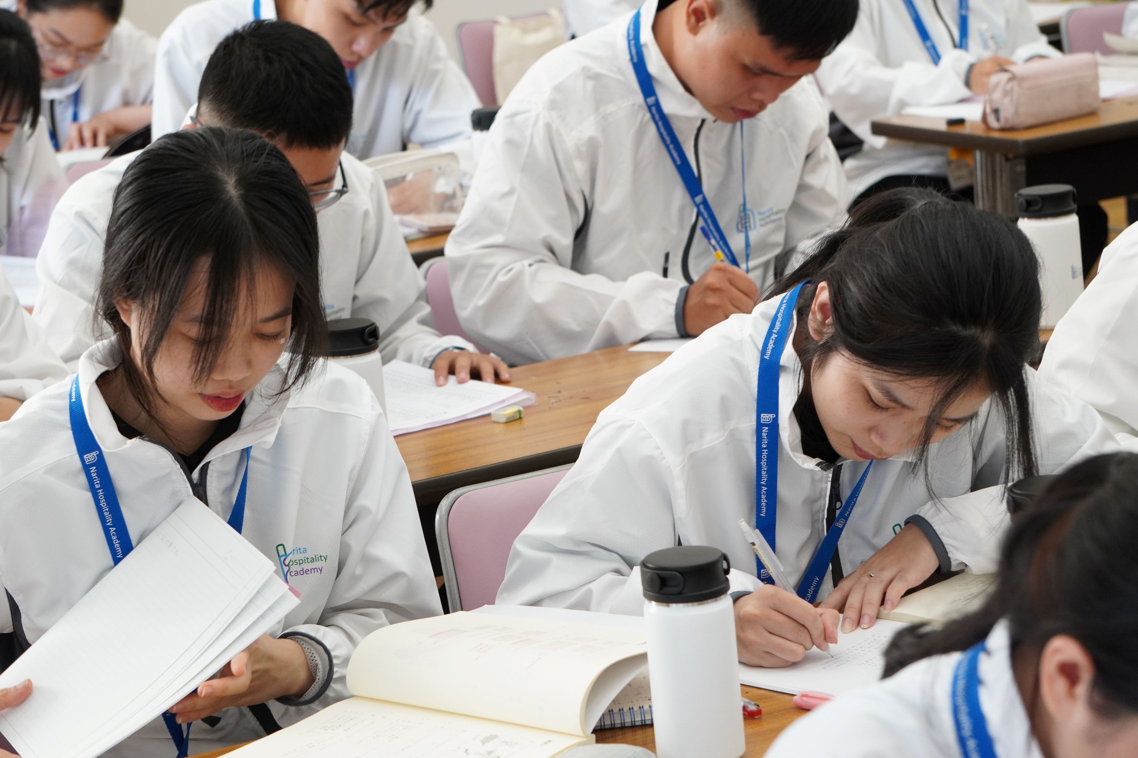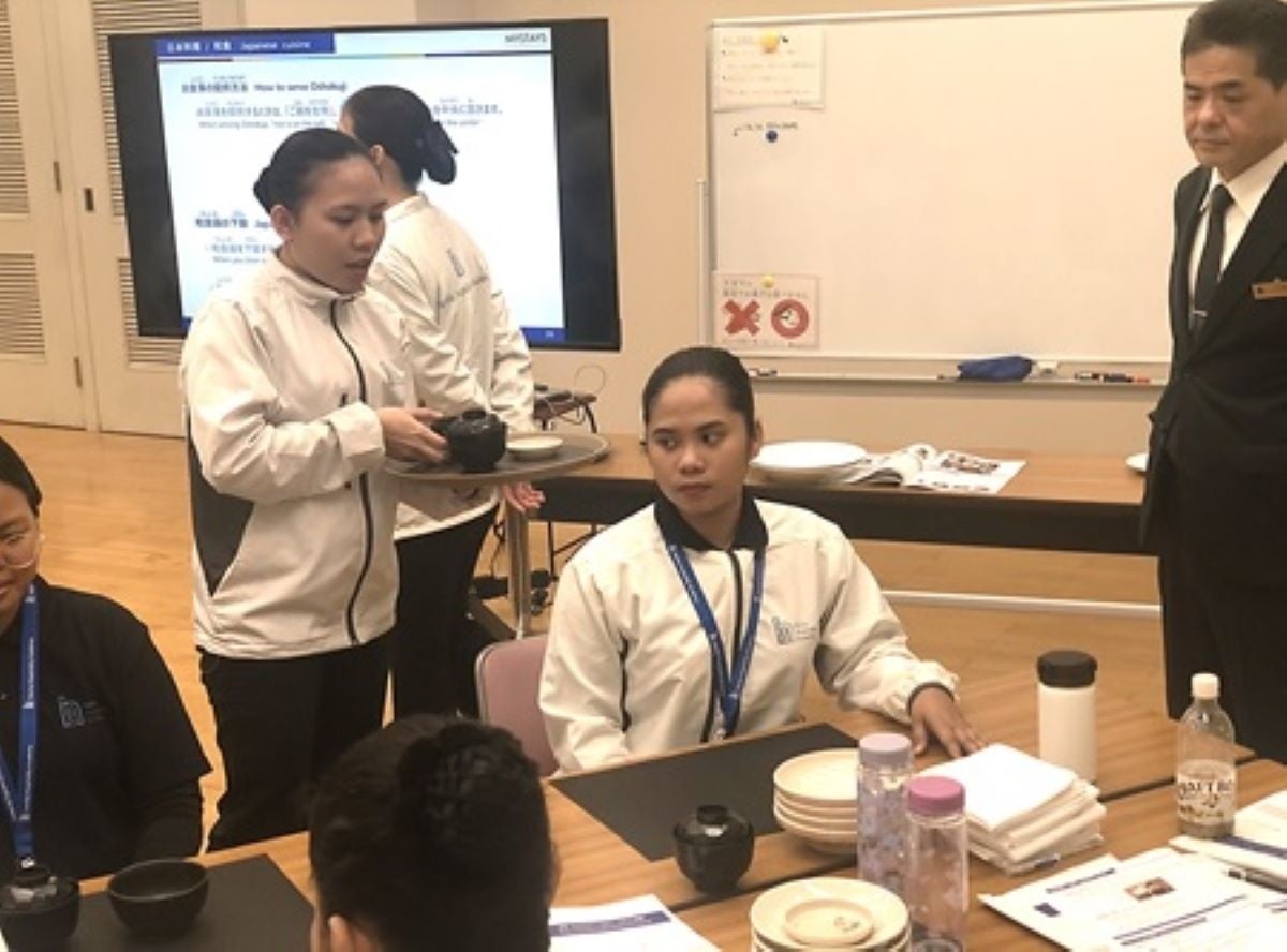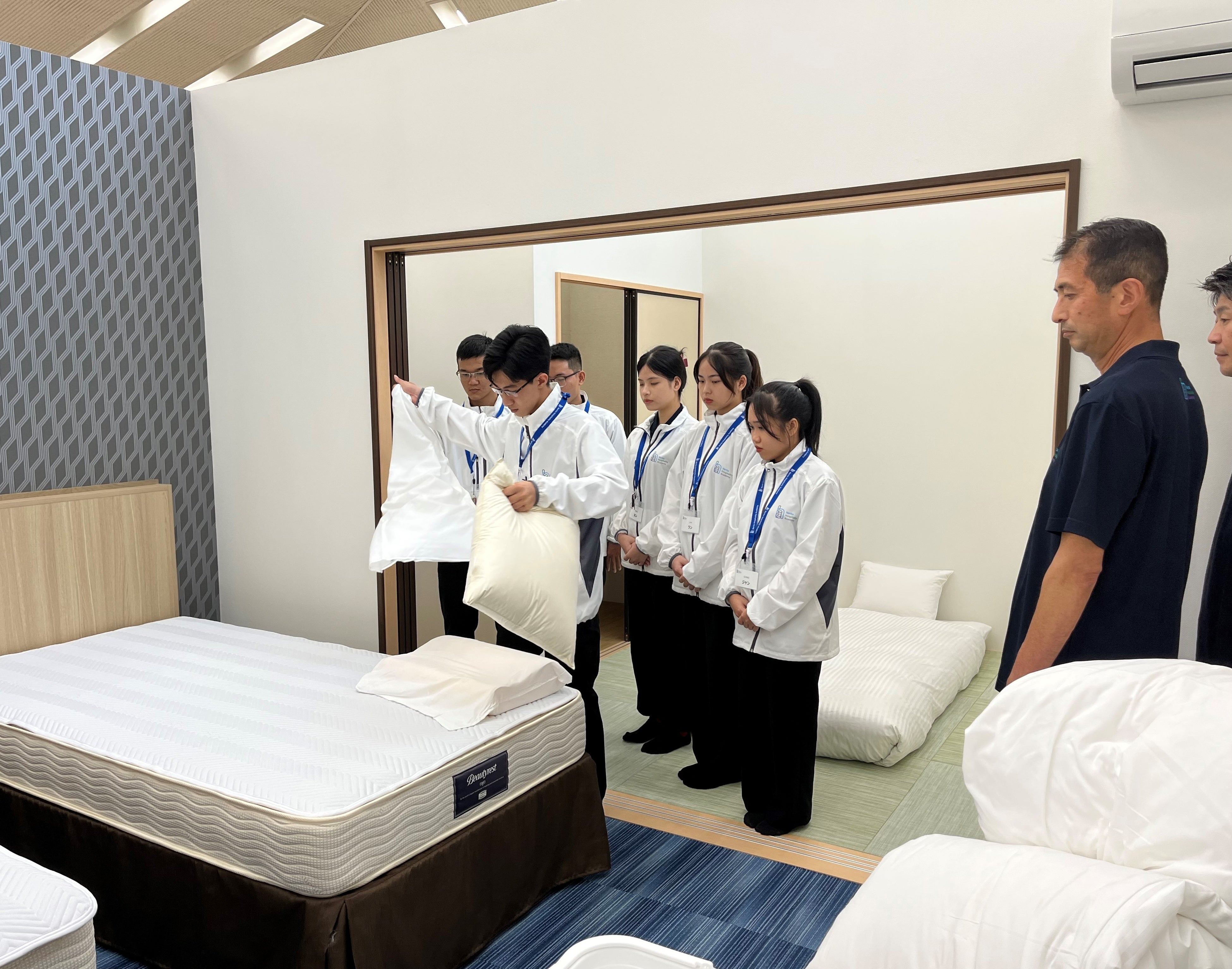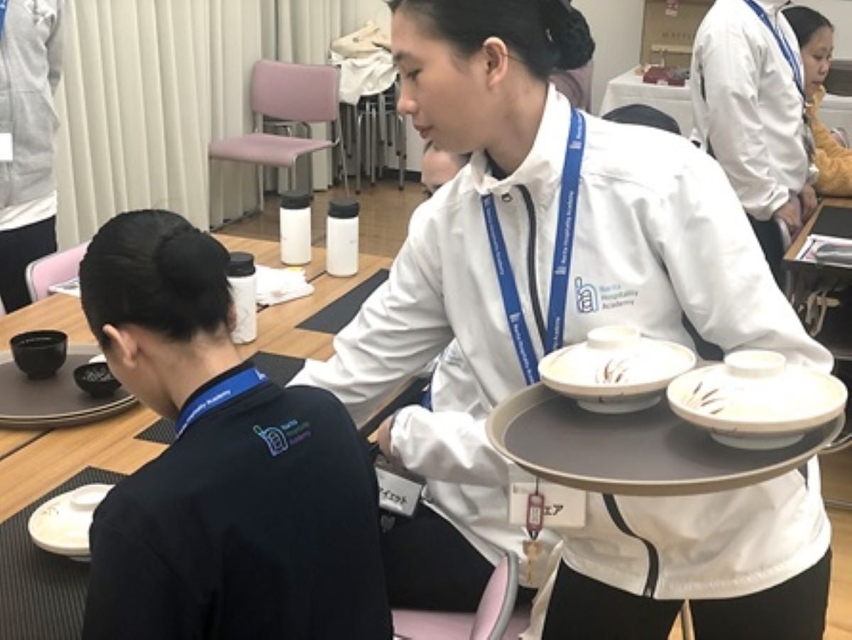 日本語や日本の生活様式を学ぶだけでなく、施設内に設けたホテルの客室を想定したモックアップルームでの客室清掃のほか、第二期からは、飲食サービスの業務など宿泊施設での就業に必要なレストラン研修を新たに設けました。本アカデミーでは、ホテルにまつわるさまざまな技術指導が受けられます。