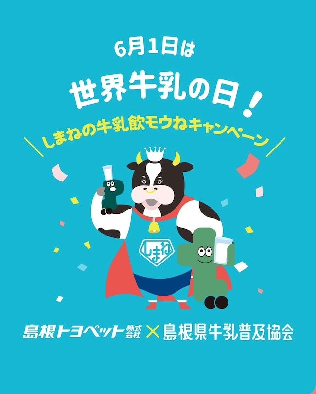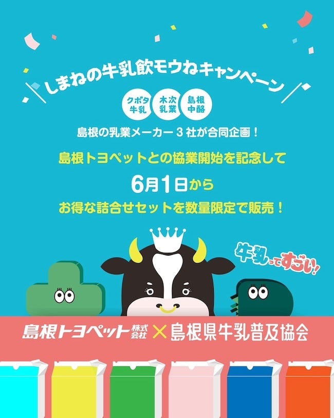 島根県乳業協会は、2025年6月1日(日)から6月30日(月)までの1か月間、県内の乳業3社(クボタ牛乳・島根中酪・木次乳業)合同で、「しまねの牛乳飲モウねキャンペーン(https://shimane-milk.com/)」を開催いたします。