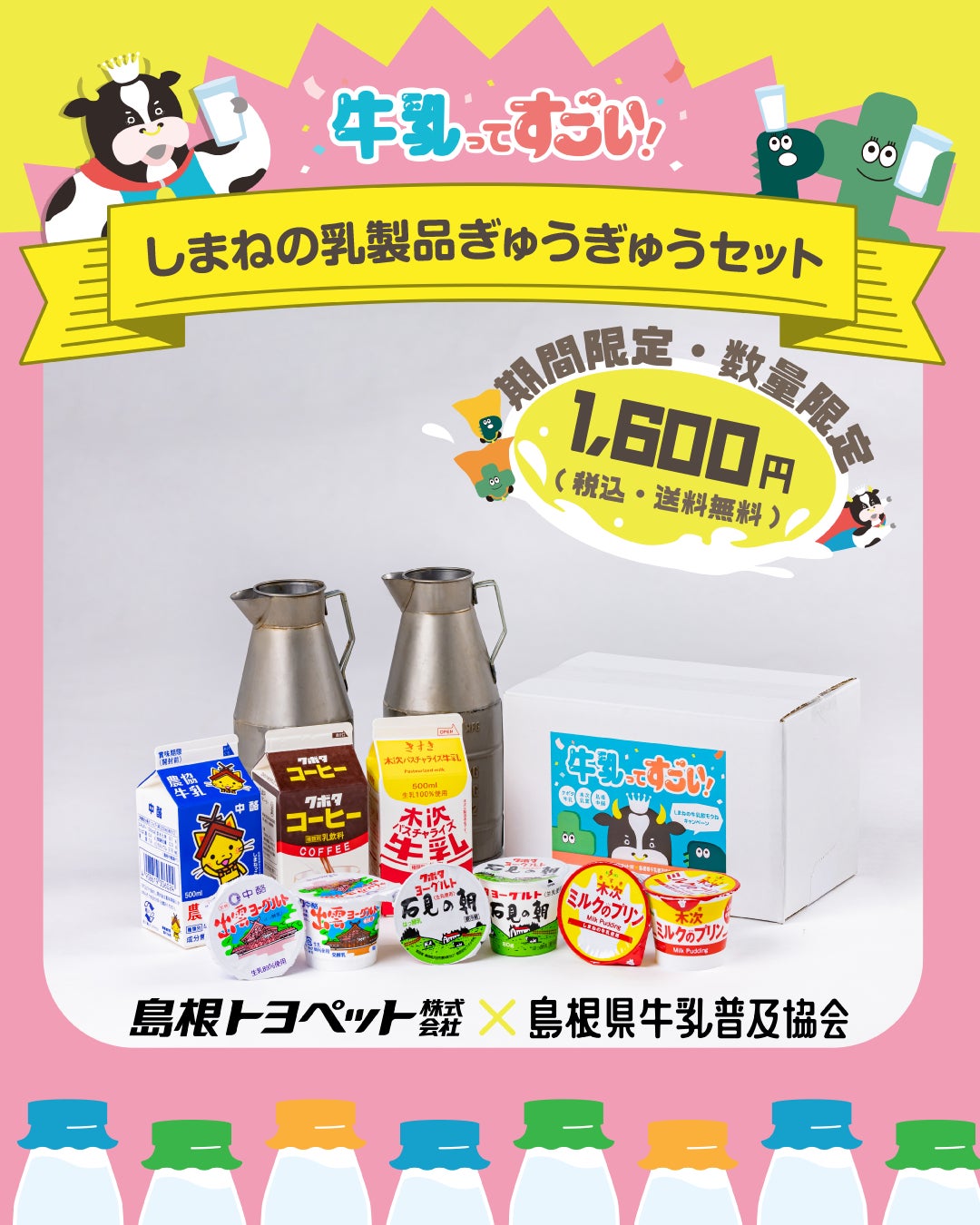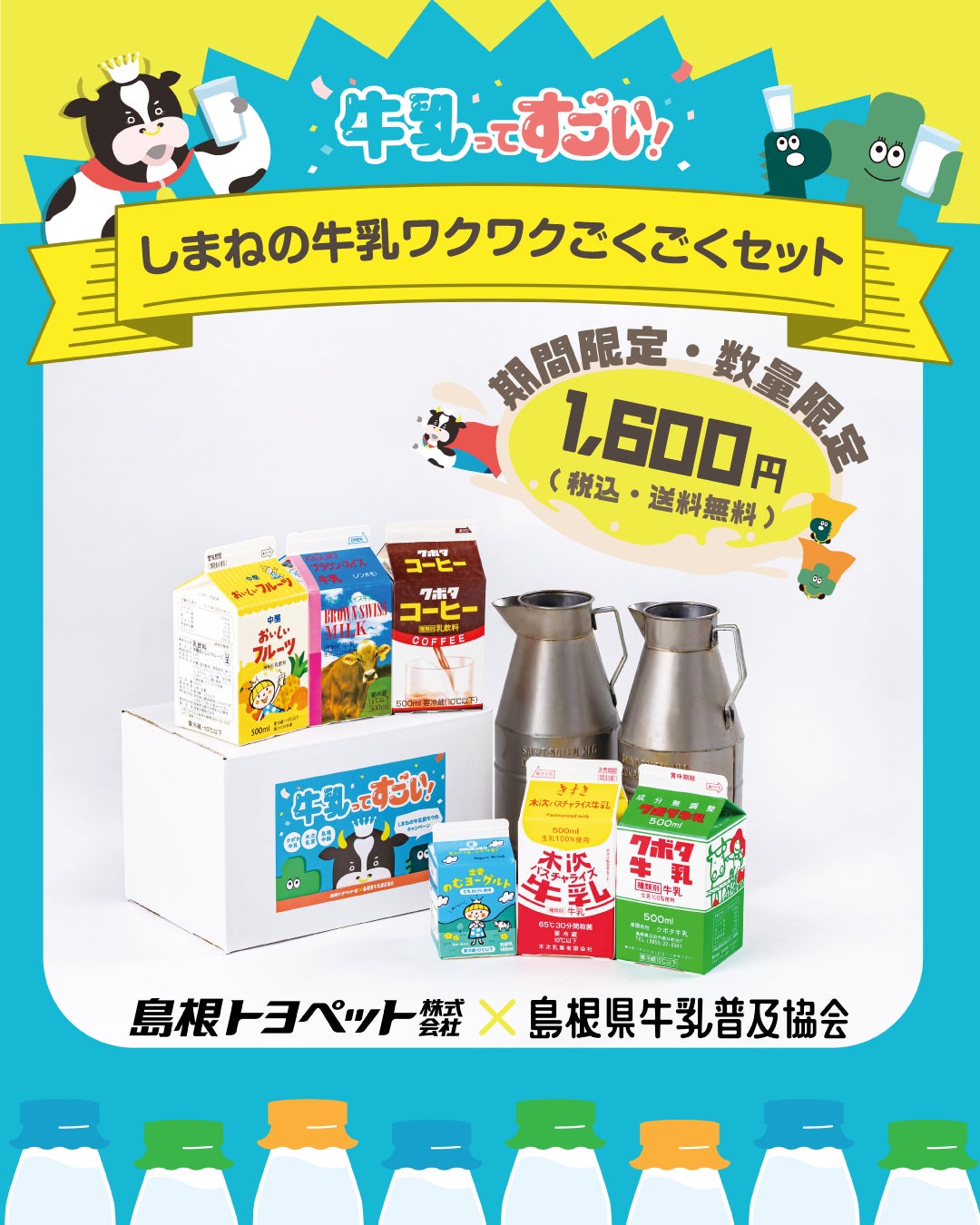 この新しい取り組みを記念して、本キャンペーンでは、地元島根県産牛乳の美味しさや魅力を多くの方に知っていただくことができる、乳業3社の人気商品を詰め合わせた特別記念セットを数量限定で販売いたします。地元の牛乳を知って、おいしく、元気に、楽しくなれるような取り組みを広げていきます。