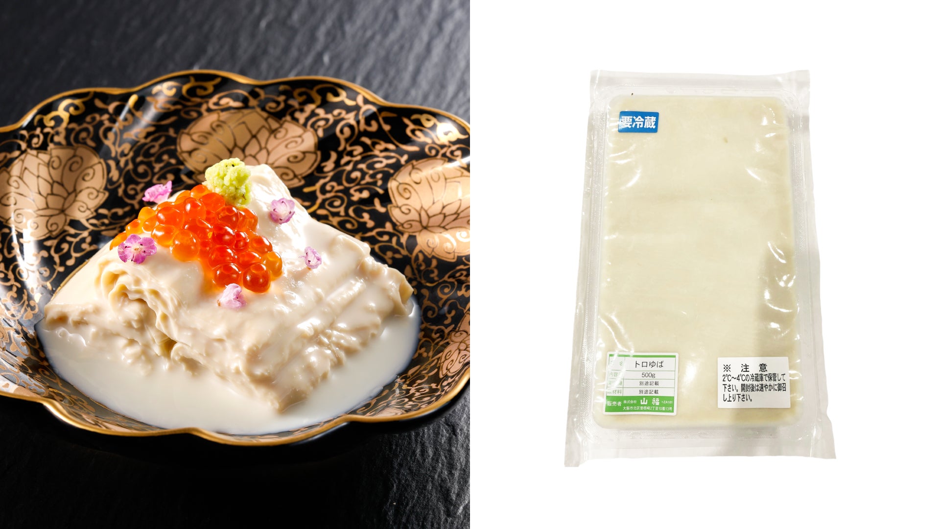 加熱した豆乳の膜を1枚1枚手仕事で引き上げたクリーミーな生湯葉。和食・洋食・イタリアンなど、様々なお料理に合わせやすく前菜からデザートまで幅広くお使いいただけます。
