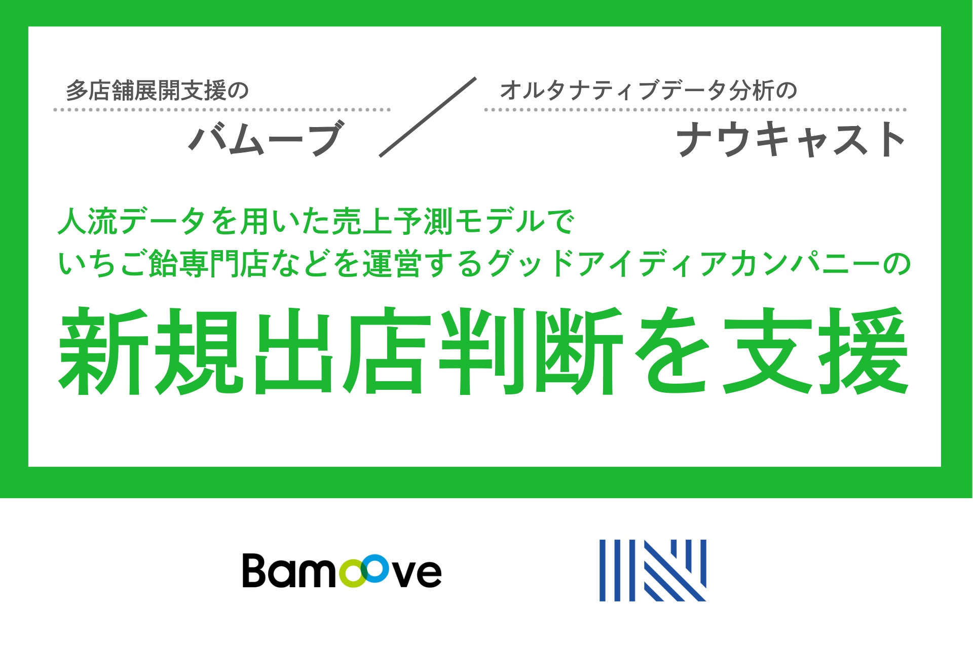 株式会社Bamoove(本社:大阪府大阪市、代表取締役社長:嵜本 将光、以下「バムーブ」)と株式会社ナウキャスト(本社:東京都千代田区、代表取締役CEO:辻中 仁士、以下「ナウキャスト」)は共同で、人流データを用いた売り上げ予測モデルでGOOD IDEA COMPANY株式会社(本社:奈良県北葛城郡、代表取締役社長:竹森 俊彦、以下「グッドアイディアカンパニー」)の新規出店判断を支援しました。