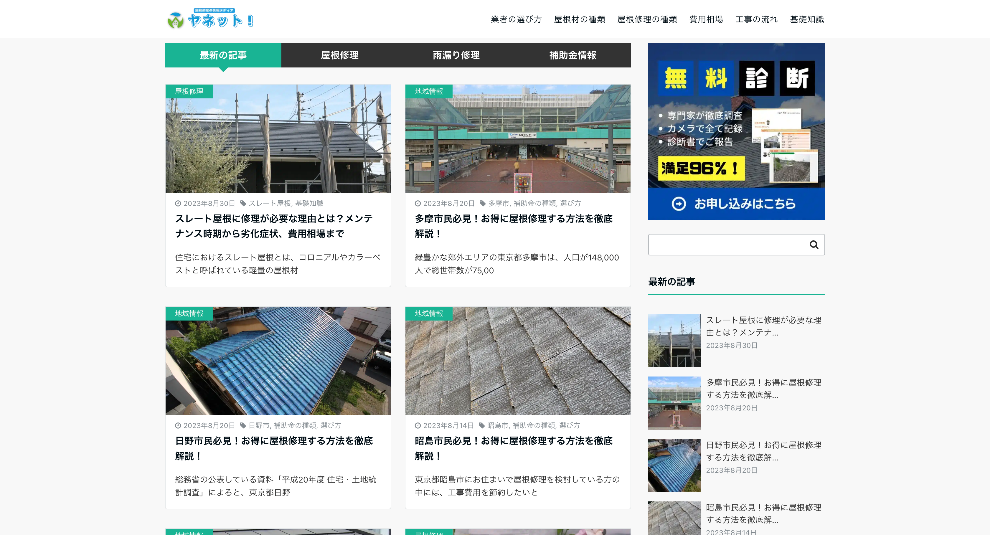 当社の運営する屋根修理情報メディアのヤネットは、初めて屋根修理を行う方向けに、「屋根修理業者の選び方」や「知っておきたい屋根工事の基礎知識」などをわかりやすく解説しているサイトです。