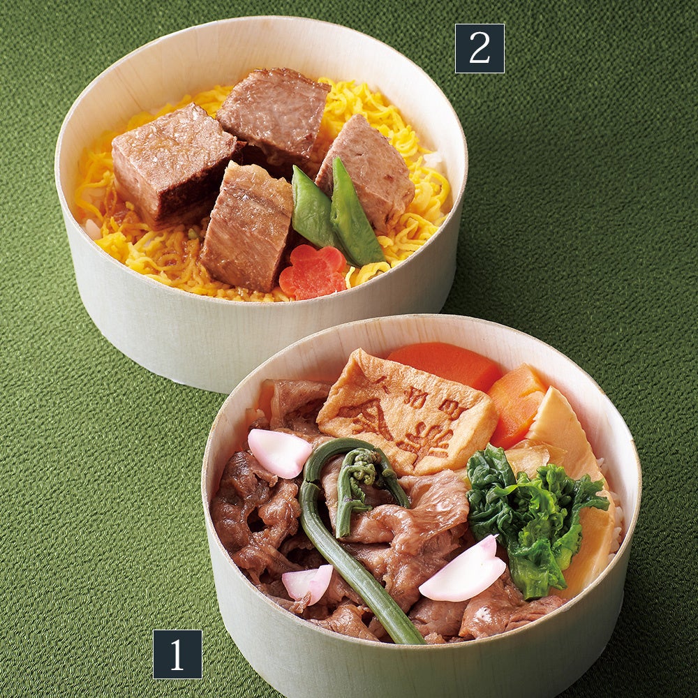 四季の野菜を添えた「季節のすき焼御膳」と、ステーキなどに仕立てた「肉御膳」 を2食ずつ計4食、ご飯に盛り付けて冷凍便でお届けします。厳選した黒毛和牛の未経産の雌牛使用。部位ごとに異なる魅力を存分にお愉しみください。