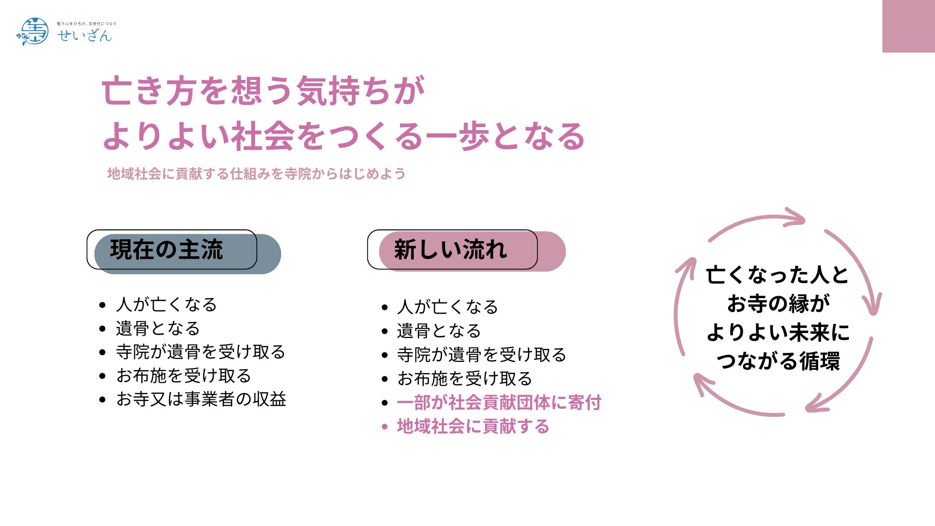 「故人を偲ぶ心を社会に還元する」ことを目的に納骨堂での弔いをきっかけに寺院に納められるお布施を社会に還元することで、社会にひらくお寺の制度を設けました。