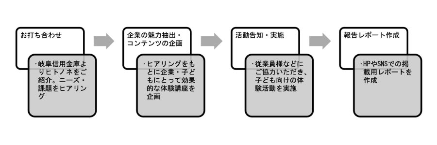 今回、岐阜市の子どもを対象とした職業体験や探究型学童保育、放課後等デイサービスなど教育・福祉事業を運営する一般社団法人ヒトノネと連携し、一般社団法人ヒトノネが地域の子供達に対して行う体験学習等の教育を通して、地元企業のSDGsを起点としたブランディングや人材力強化を支援する体制を作りました。SDGsへの取り組みは、企業の採用力や企業価値に直結する時代です。SDGsへの取り組みや採用、人材育成・ブランディングなどに課題を抱える地元企業を、岐阜信用金庫が一般社団法人ヒトノネに紹介し、一般社団法人ヒトノネが地元企業と共に小中高生を対象にした職業体験などの講座を開催することで、地元企業のSDGsの推進による価値向上に貢献します。