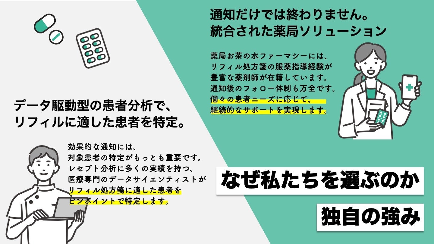 薬局お茶の水ファーマシーは、健康保険組合が実施するリフィル処方箋啓発の通知事業を支援するサービスを開始します。ジェネリック医薬品の通知事業のように、レセプトデータをもとに対象となる患者に対して、患者個々に応じたコンテンツでリフィル処方箋の制度とメリットを啓発します。