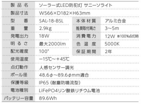太陽光で5~7時間充電し、人感センサーを利用したAUTOモードで約20時間の点灯が可能です。最大全光束は2,000lm。20VA防犯灯と同等クラスの明るさです。