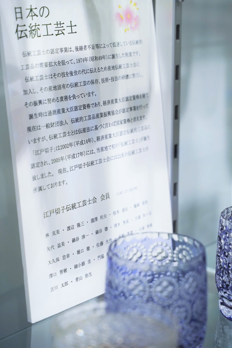 日本の伝統工芸士に認定された職人22名の作品、協同事業製品や各切子工房・職人から委託された品等、多彩な江戸切子が集う唯一の場所となっています。