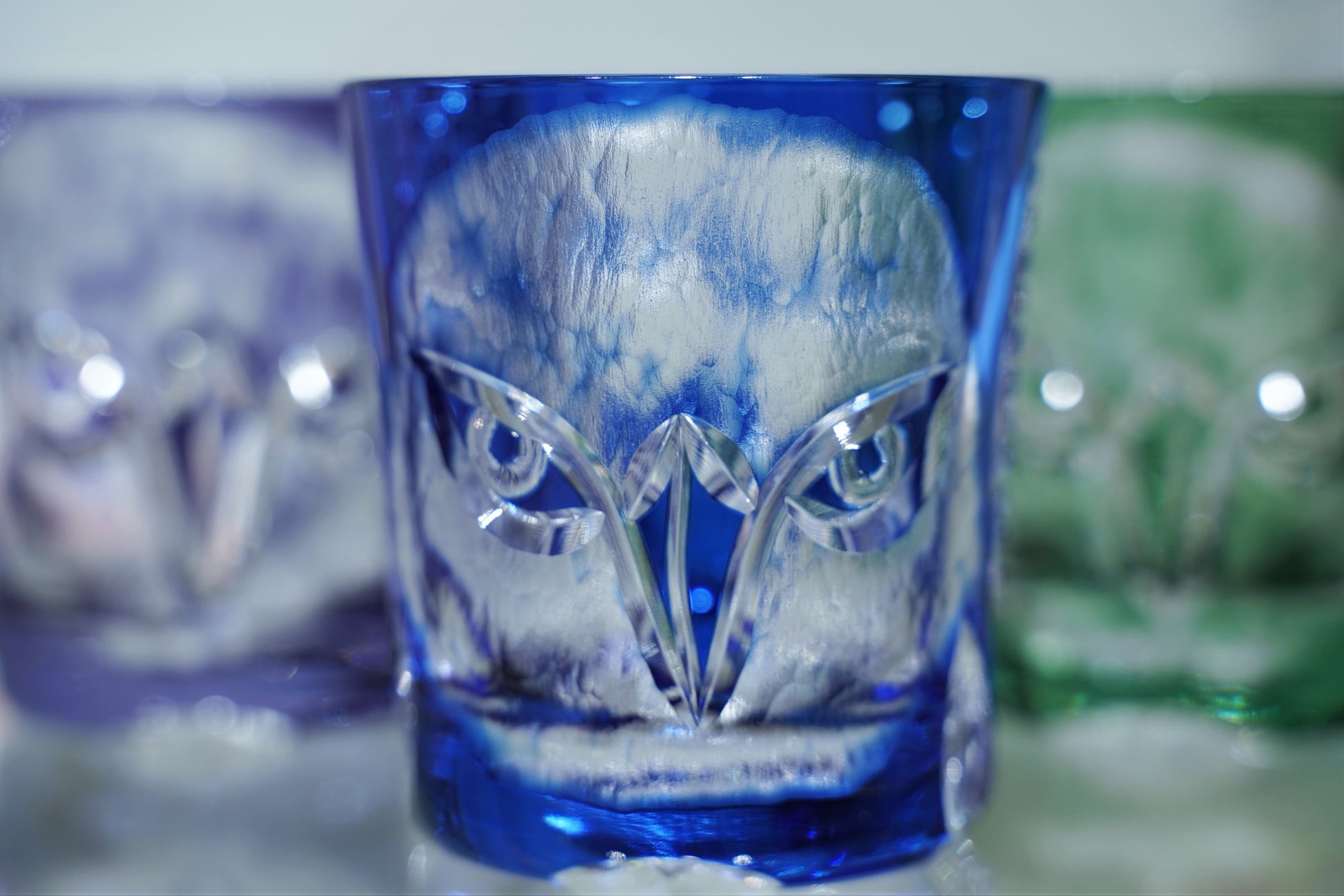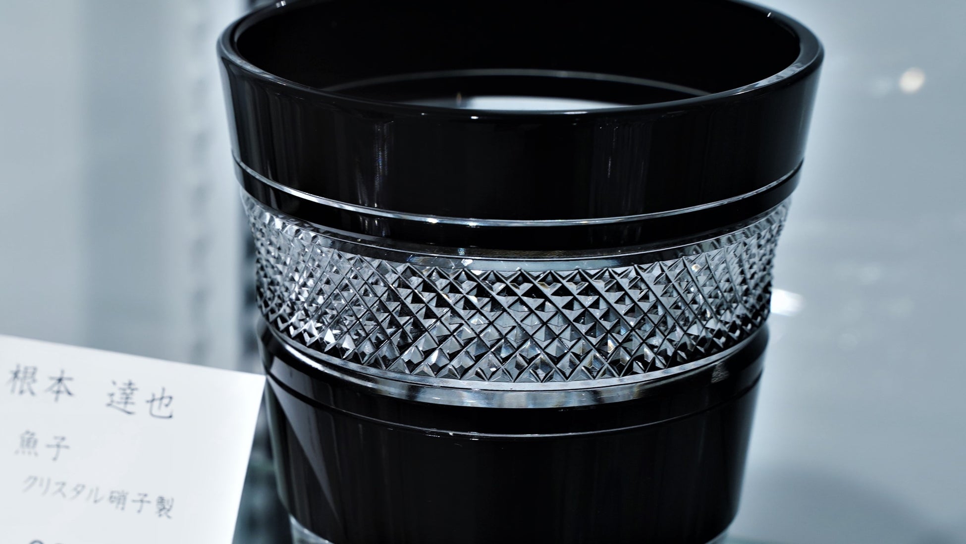 V字の菱カットによる伝統的な笹の葉と矢来文様、蒲鉾(カマボコ)と呼ばれるR形状のホイールによるU字のカットを大きく縦に刻み、クリスタルの透明度を活かした輝きと映り込みの美しさを組み合わせたもの。“深く鮮明で正確であり仕上がりがはっきりとして華やか”という江戸切子の特徴もよく表した品です。