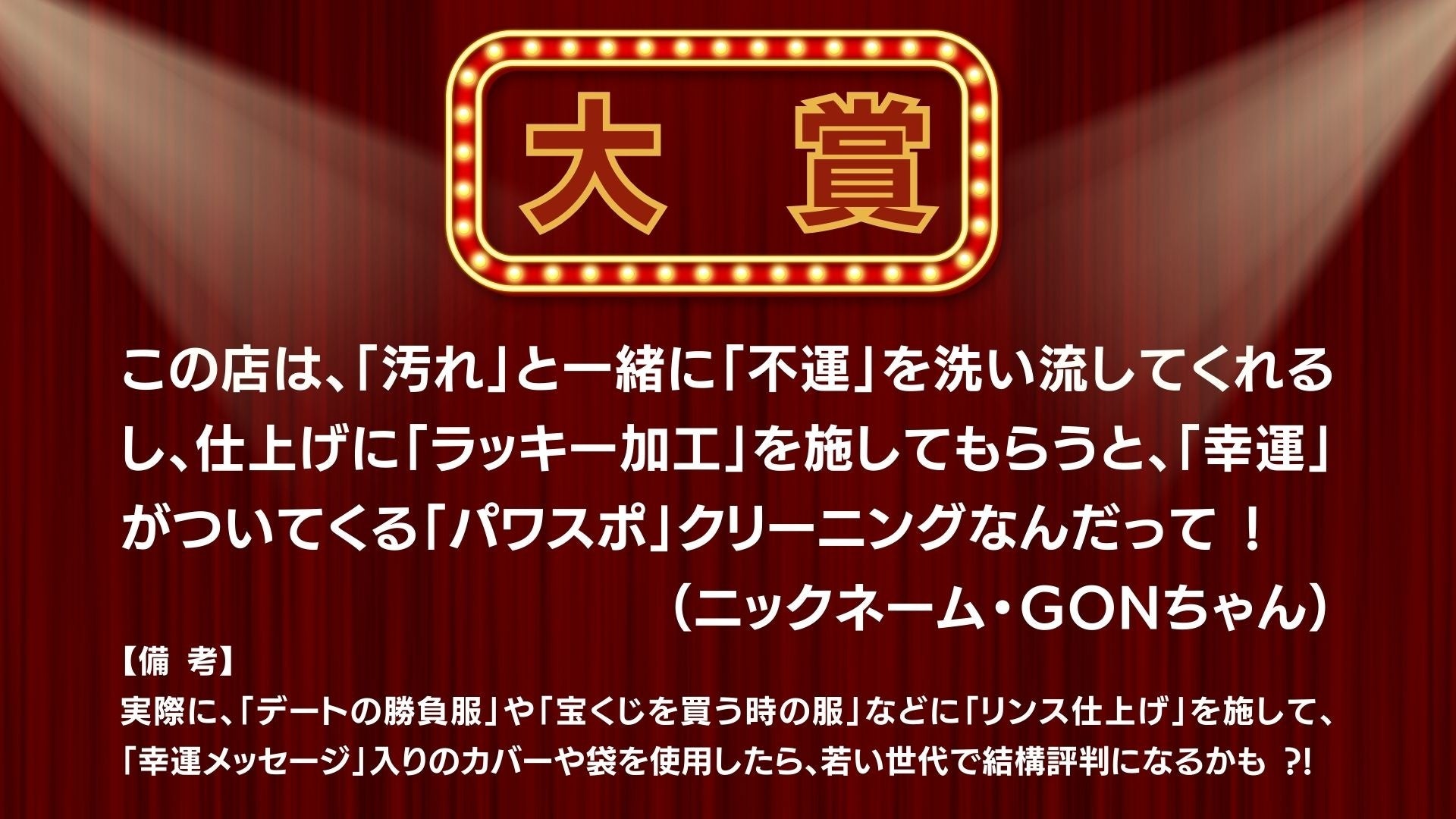 結果300を超える応募があり、その中から第一回おもしろ大喜利コンテストの大賞は、『この店は、「汚れ」と一緒に「不運」を洗い流してくれるし、仕上げに「ラッキー加工」を施してもらうと、「幸運」がついてくる「パワスポ」クリーニングなんだって !』(ニックネーム・GONちゃん)に決定いたしました。