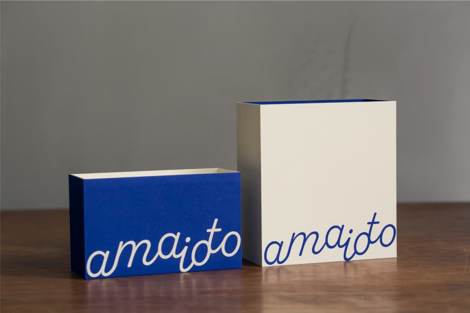amaiotoのパッケージは、北海道札幌市のモリタ株式会社によるオリジナルのVカットBOXです。ブルー&アイボリーのコントラストが鮮やかなデザインで、自分用はもちろんのことギフトにも最適です。二次利用が可能なサステナブルなボックスは、お召し上がり後も小物の収納など自由な発想でお使い頂けます。