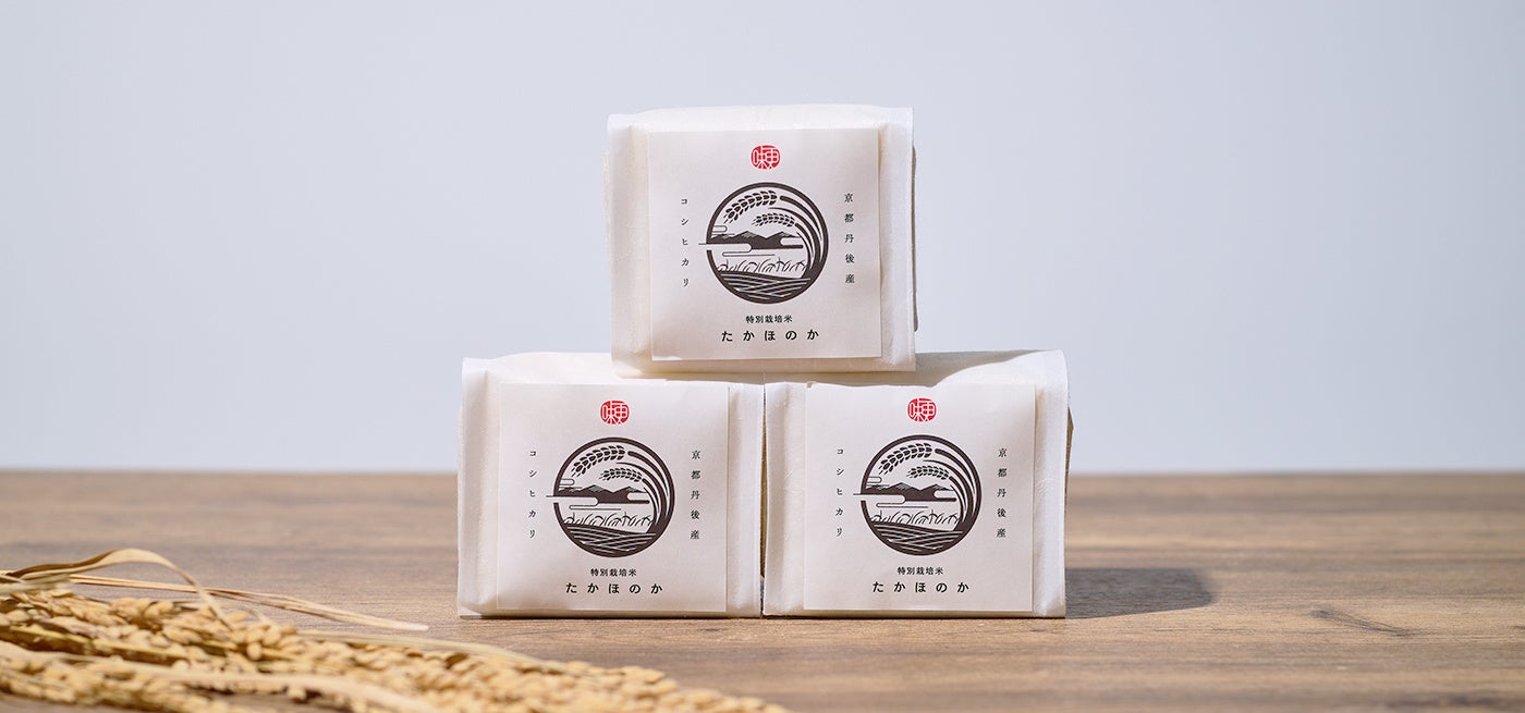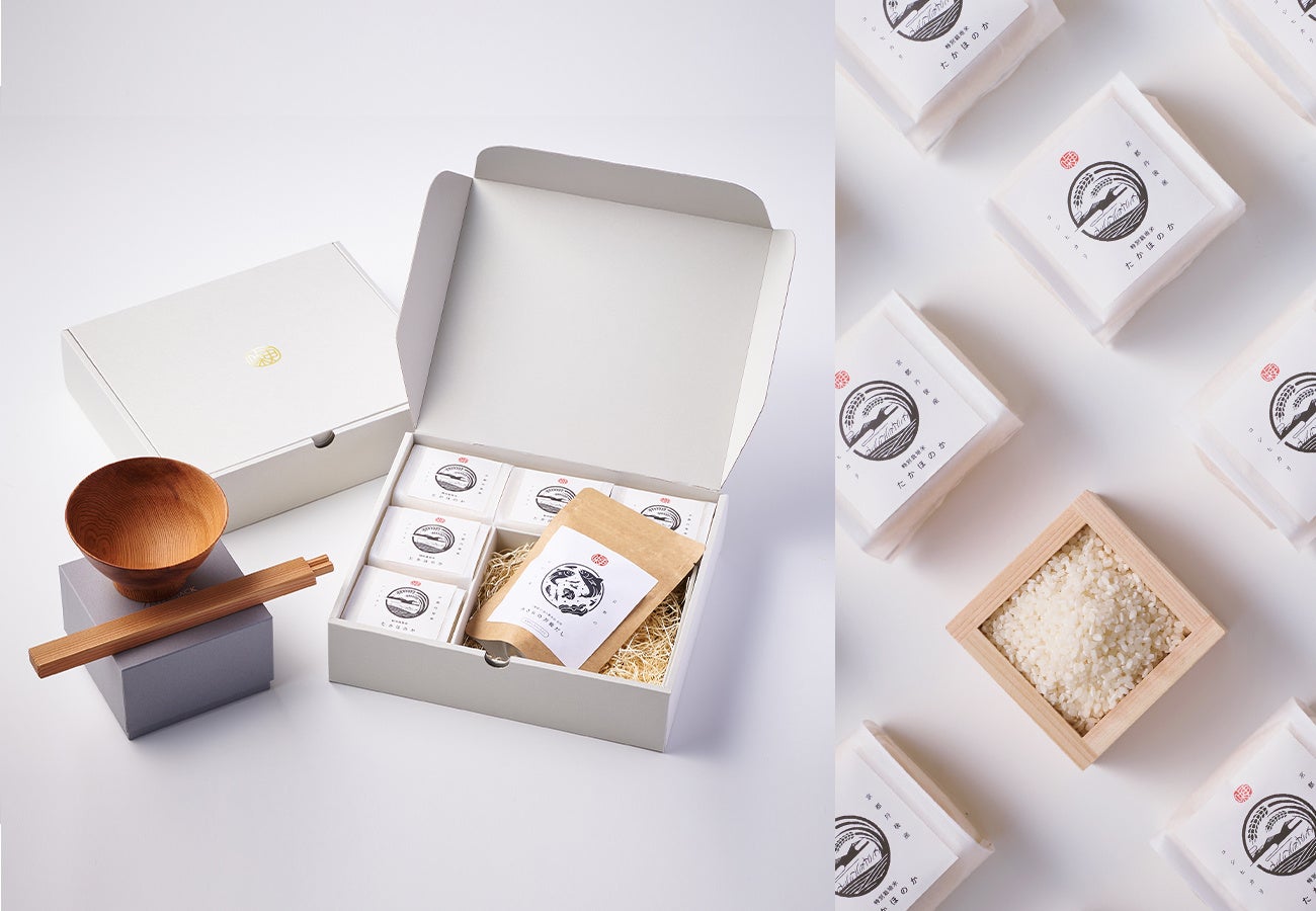 ギフトを受け取った方が晴れやかで明るい気持ちになれるよう、清潔感のある上品なデザインでパッケージを仕上げました。また、京都丹後の歴史と文化を表現するため、個包装のパッケージに家紋調のロゴを採用しています。お米の味わいはもちろん目でも楽しんでいただける贈り物にぴったりのギフト商品です。