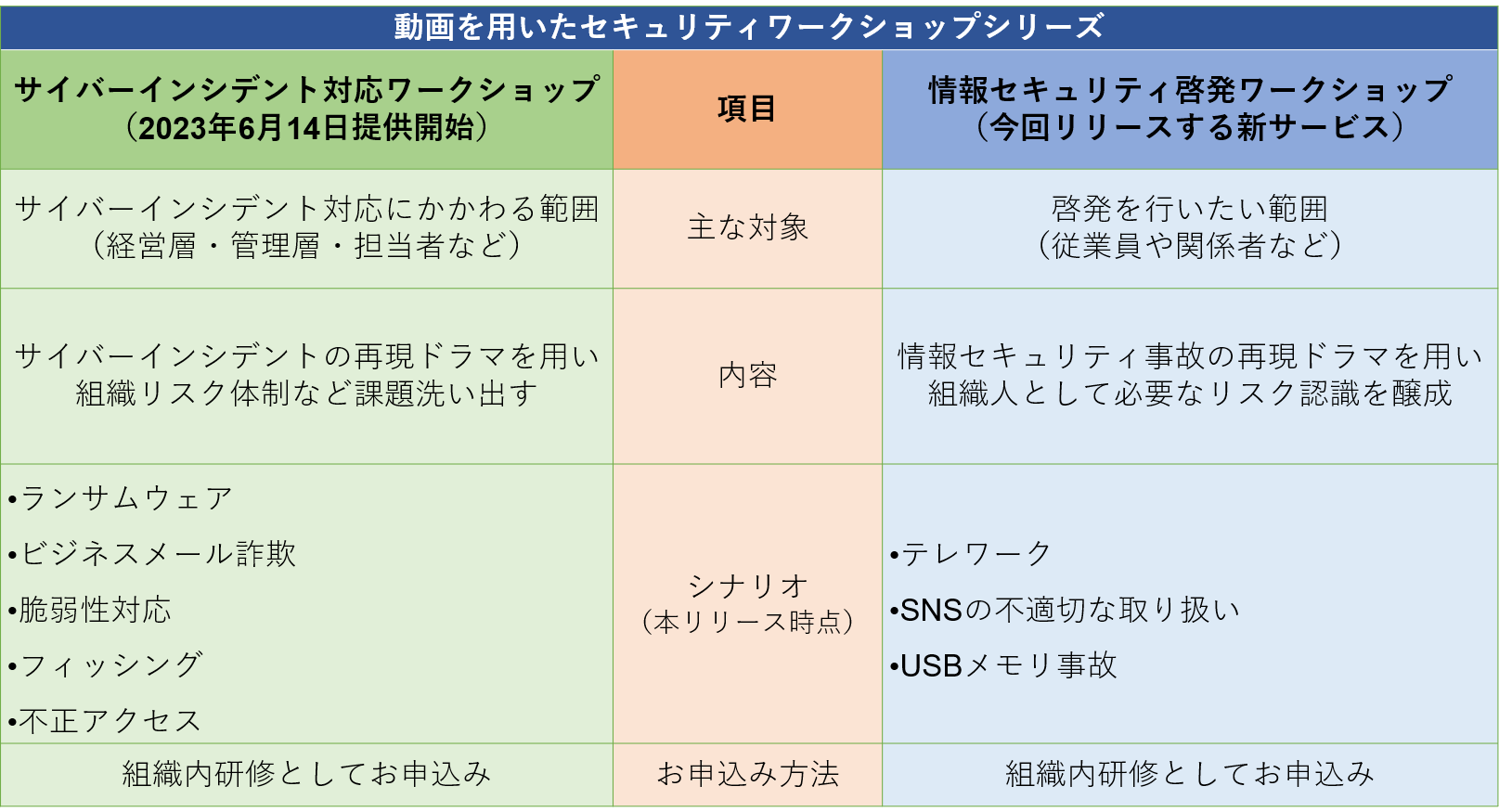 架空のセキュリティ事故対応の動画を使用したワークショップです。基本的にオンライン(Zoom)を用いて実施いたしますが、実際にご指定の研修場所に講師が訪問することも可能です。また、研修対象者のレベル等に応じて実施形式を選択可能(発言形式/クイズ形式/講師による解説のみ)です。