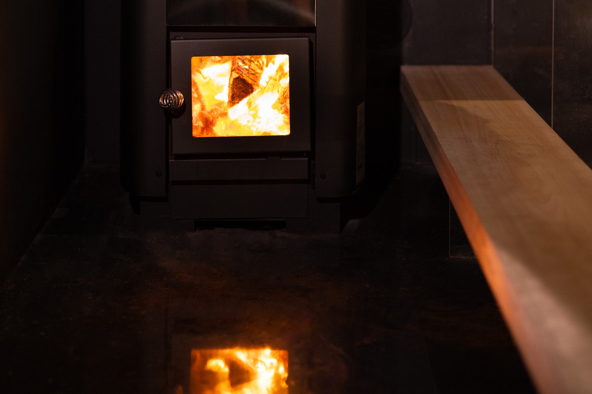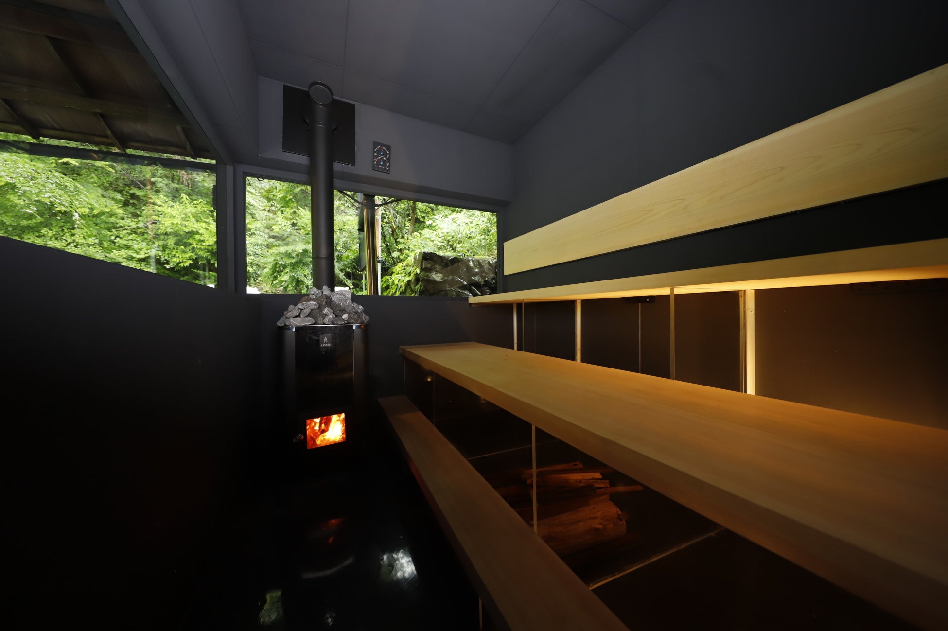 サウナストーンの選定から組み方までこだわった薪サウナ。電気ではなく薪で温めることで、熱がやわらかく、じっくり芯から温まります。パチパチと燃える音や香り、包み込まれるようなロウリュも五感を刺激します。