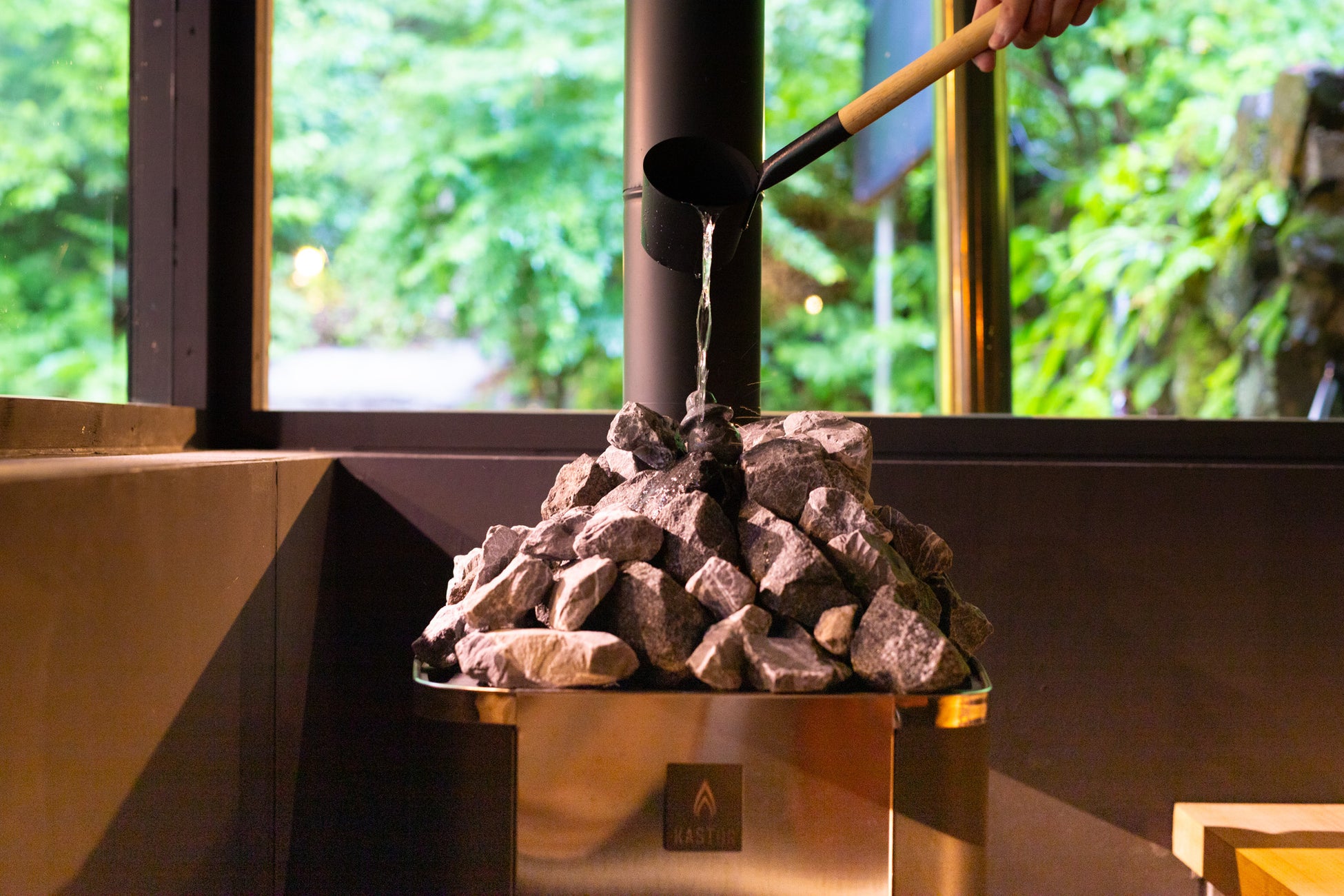 屋根を高く設計し、排気の位置も工夫されたサウナ室内は、息苦しさが少なく快適。ロウリュ用のアロマは、奥多摩の自然に合うオリジナルブレンド。Bluetoothスピーカーで音楽も楽しめます。
