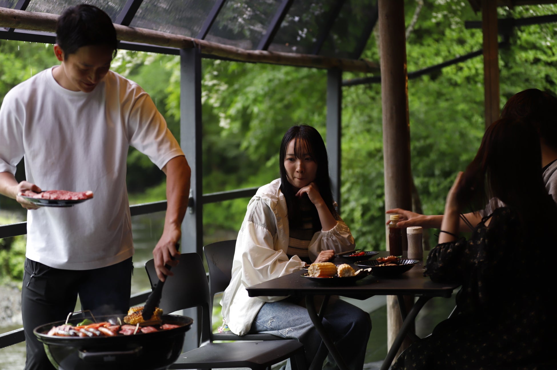 敷地内には屋外BBQエリアを完備。好きなタイミングでサウナに入り、気分が高まったらそのままBBQ。時間に縛られず、自然の中で自由な滞在が楽しめます。