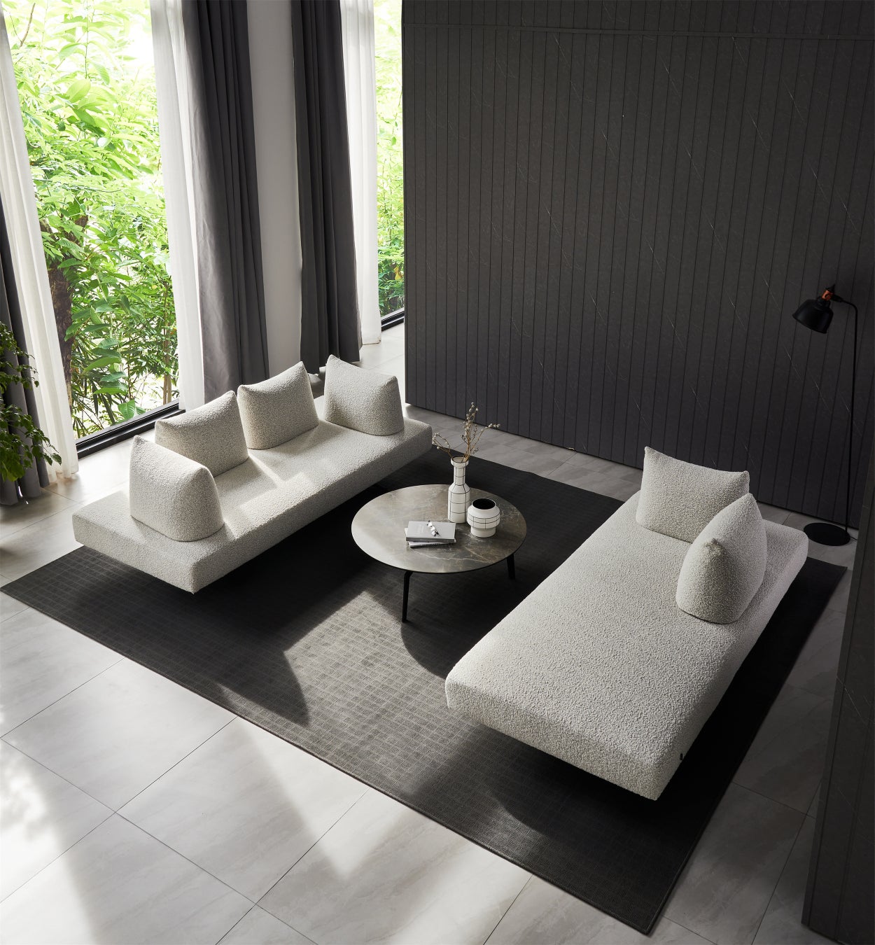 金属や石、ガラスやレザーなどの異素材を組み合わせてデザインされた家具はシンプルながらも独創的で存在感のある空間を演出します。