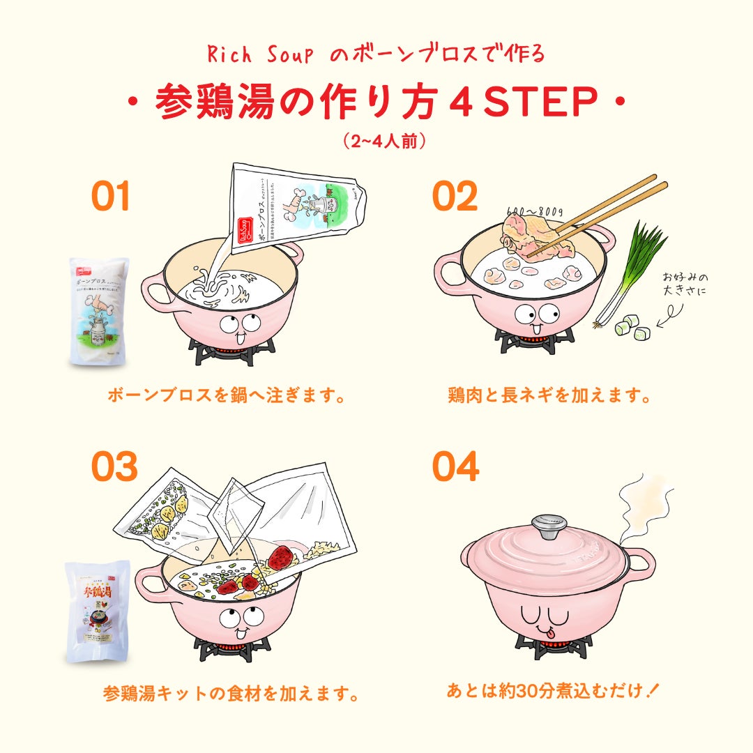 Rich Soupで作る参鶏湯の一番の魅力は、薬膳食材と鶏肉を煮込んで滋養強壮効果を得る栄養食「参鶏湯」を、旨味も栄養も濃厚に溶け込んだRich Soupの「ボーンブロス」で作るという"夢の組み合わせ"であるということです。ボーンブロスではなく"水"を使っても参鶏湯を作ることができますが、旨味も栄養も物足りない仕上がりになってしまいます。