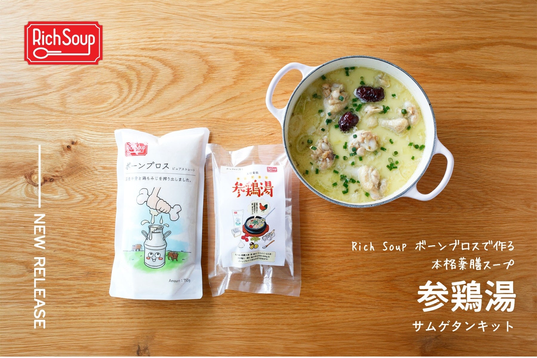 そんなRich Soupのボーンブロスで薬膳食材と鶏肉を煮込むだけの簡単な調理で本格参鶏湯(サムゲタン)を作ることができる「参鶏湯キット」を、この度Rich Soupより発売することとなりました。