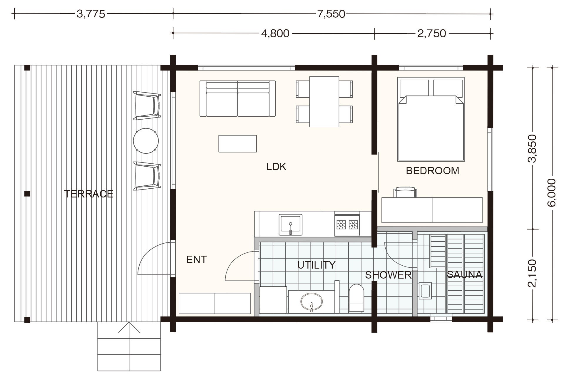 サウナ室に、キッチンも付いたLDKと寝室一部屋からなる約45㎡の「ヒュッティ」は、サウナのある暮らしを楽しめます。大きな窓と広いテラスが特徴のヒュッティでは、周囲の自然ともなじみやすく、テラスでは外気浴やバーベキューも。