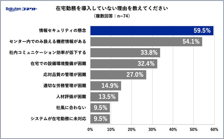 在宅勤務を導入していない理由を聞いたところ、「情報セキュリティの懸念があるから」(59.5%)が最も多く、次いで「センター内でのみ扱える機密情報があるから」(54.1%)、「社内コミュニケーションの効率が低下するから」(33.8%)と続きました。